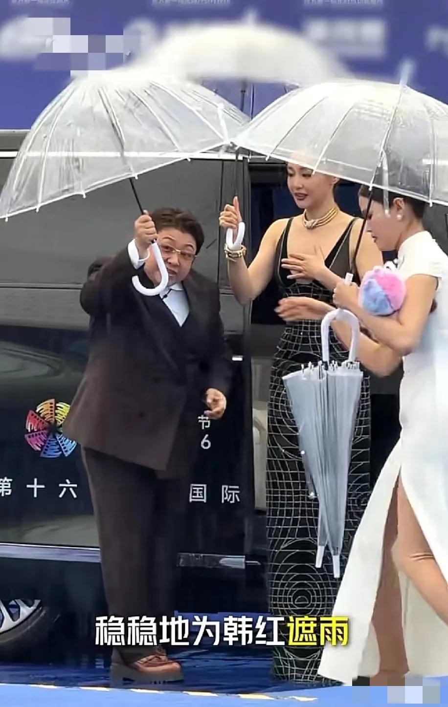 韩红和高叶一同出席北京国际电影节,现场下着瓢泼大雨,韩红下车后紧皱眉头,立刻转身伸手搀扶高叶下车,而且她当时是淋着雨的状态,把雨伞下的空间都留给了高叶。