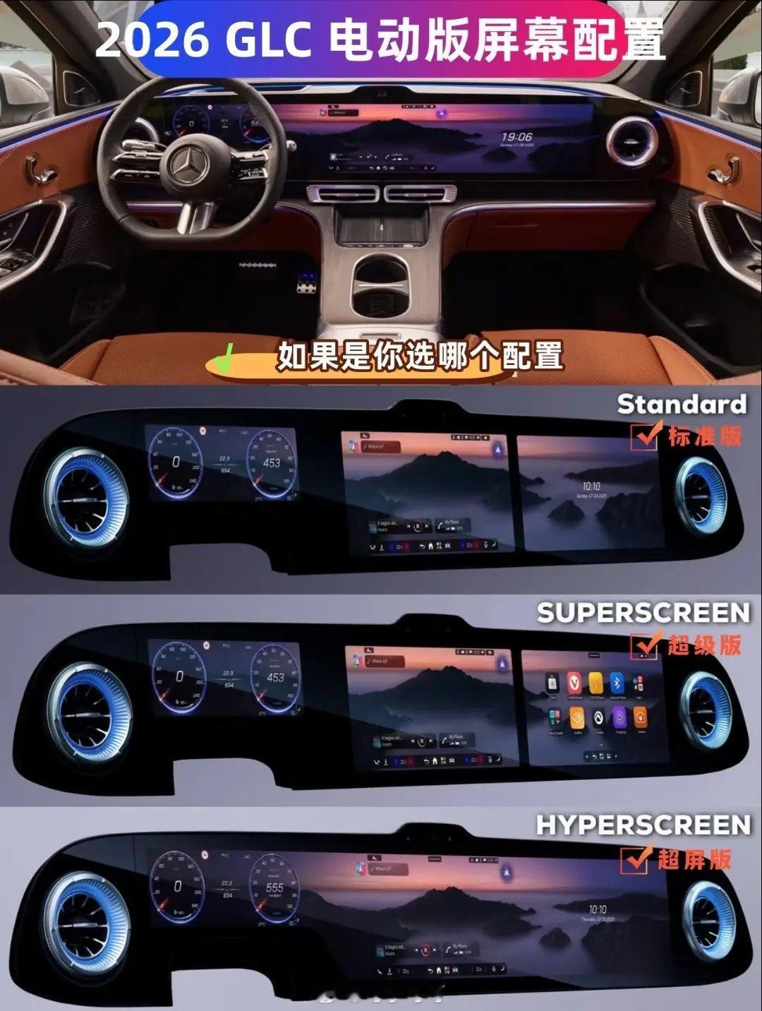 2026奔驰GLC纯电内饰这屏幕谁顶得住?🤯谁懂啊!奔驰真的把电动化的“排面”卷到极致了!2026款GLC纯电版内饰曝光,三块屏幕配置直接封神,看完谁不想立刻换车!从内饰图能看到,它彻底抛弃传统座舱,走极致科技豪华路线:标准版是24.3英寸悬浮双联屏,简约实用;超级版升级39.1英寸一体化曲面屏,显示面积翻倍,视觉感拉满;而超屏版才是王炸!整块玻璃面板覆盖中控台,集成仪表、中控、副驾屏三大区域,副驾还能独立触控追剧,配合1000颗LED矩阵背光,开机瞬间氛围感直接拉满!更绝的是全系标配骁龙8295芯片,MB.OS系统响应丝滑到像玩手机,零层级操作不繁琐,常用功能一键触达,彻底解决大屏痛点。而且国产版还会适配本土化AI和智能语音,用起来更顺手!纠结选哪个配置?务实党冲标准版,颜值党直接锁超屏版!毕竟这种“沉浸式座舱”,才是电动豪华该有的样子!2026奔驰GLC纯电