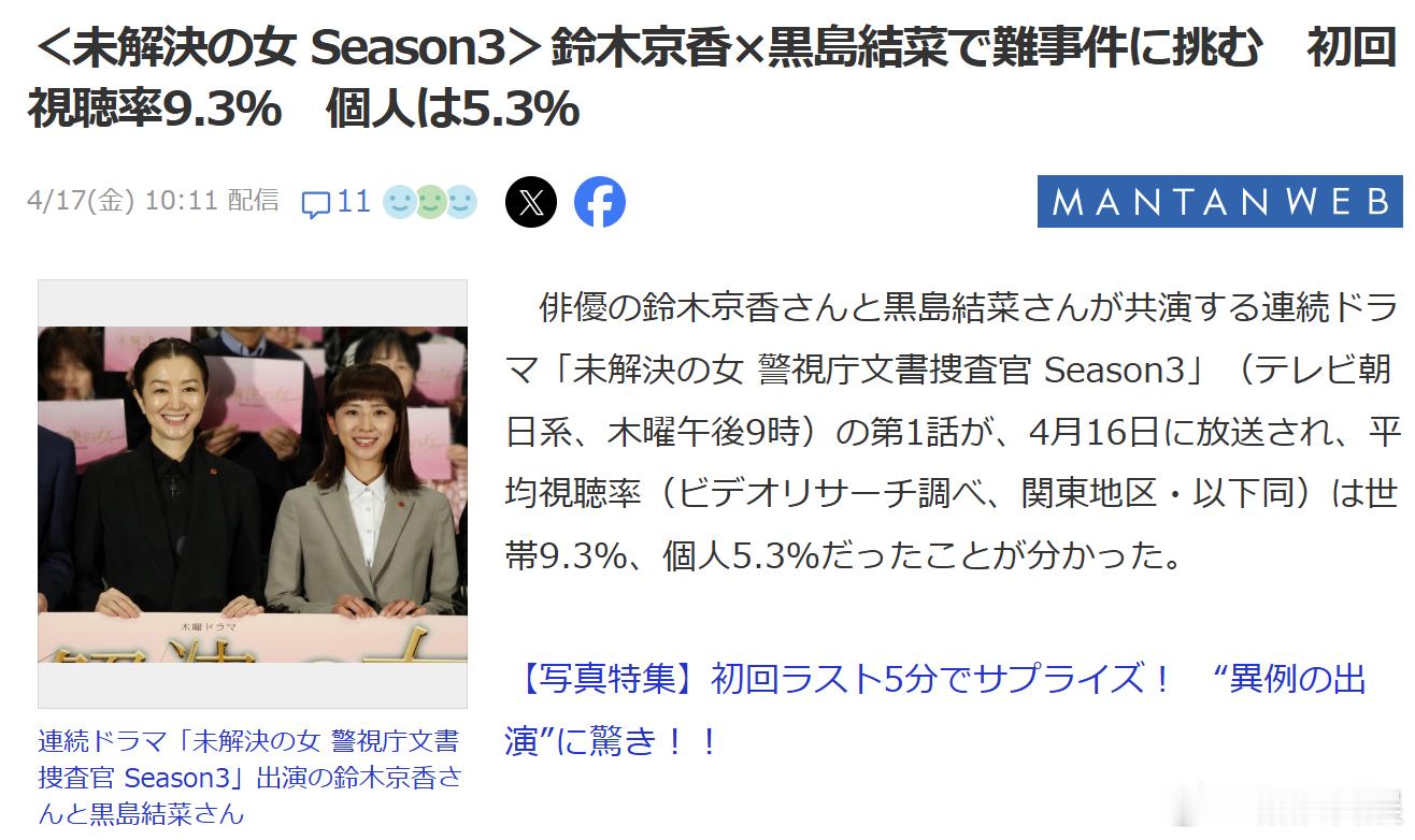 海外影视速递铃木京香主演、黑岛结菜 共演朝日台4月期木9剧《未解决之女 警视厅文书搜查官》第三季首集世代收视率9.3,个人收视率5.3。第三季中,刑警矢代朋(波瑠超话饰)调离岗位,加之系长长期空缺,第六系陷入废部危机。正当理沙意志消沉之际,陆奥日名子(黑岛结菜饰)志愿出任第六系系长。这位比理沙小近二十岁的“年下上司”让理沙既困惑又惊讶,然而日名子纯粹而认真的态度,使理沙重燃斗志。共演包括泽村一树远藤宪一山内圭哉皆川猿时。