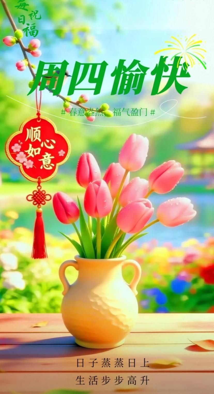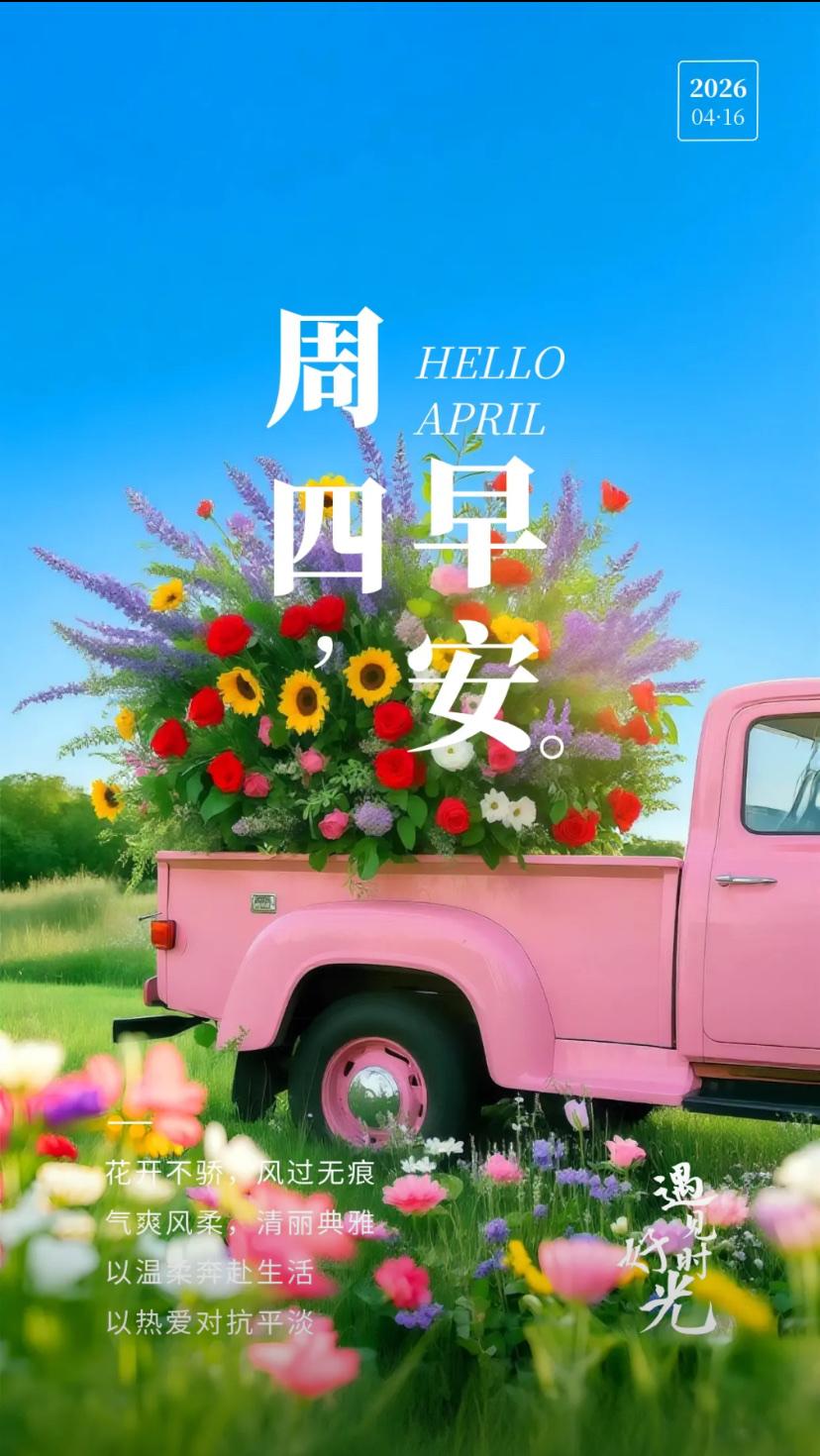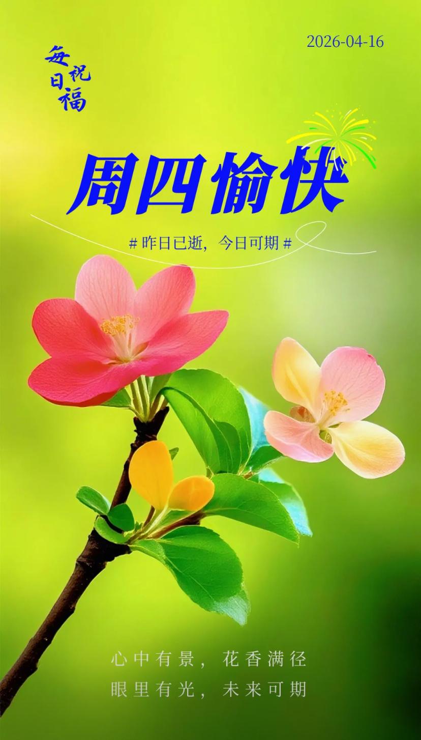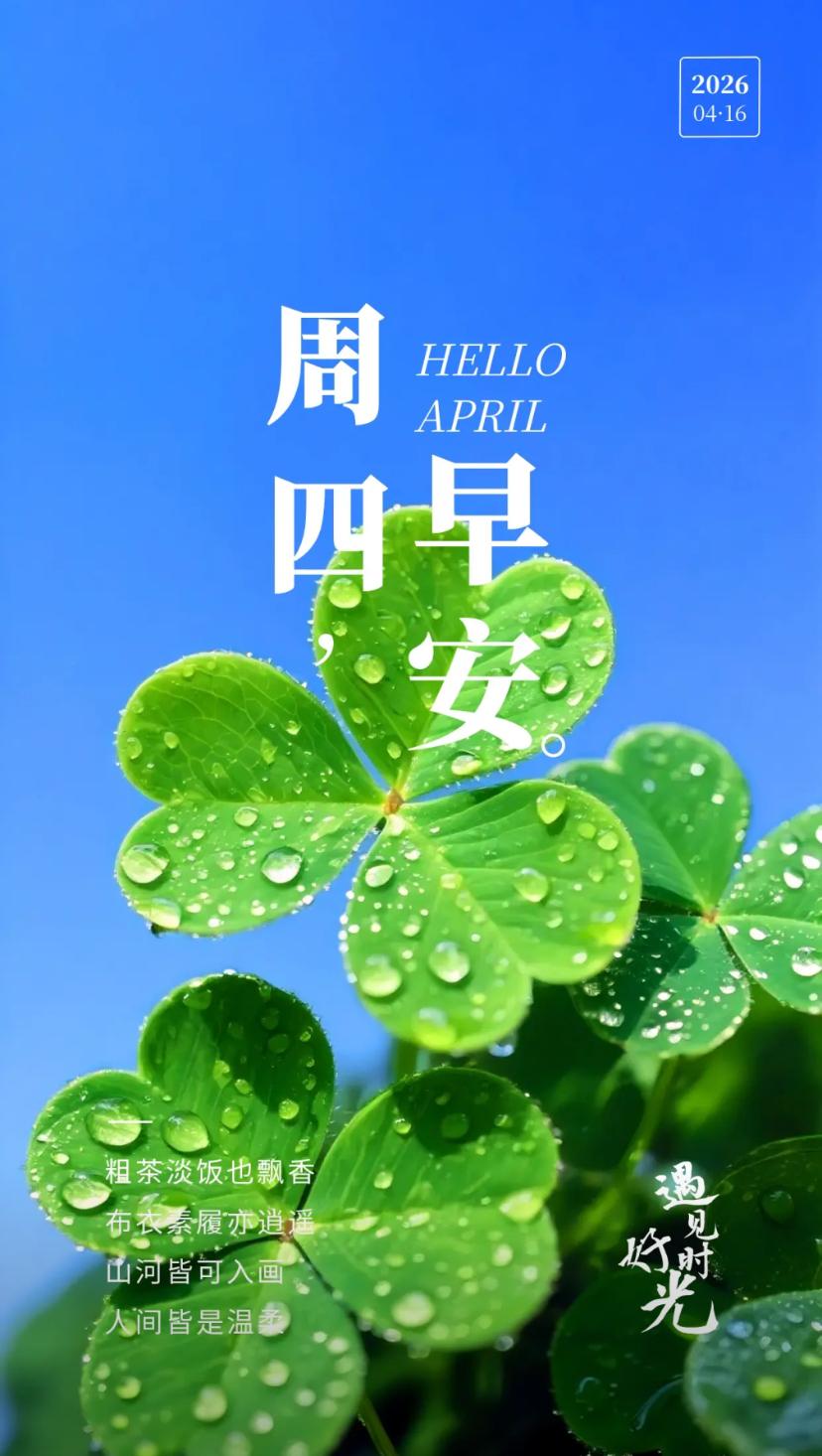 🌿🌷日子因相逢而美好,问候因牵挂而温暖,静下心稳步前行,岁月自会赠予惊喜。愿你始终心怀热爱,目光明亮,诸事顺遂。人生旅途,有繁花亦有风雨,从容走过便自有韵味;岁月悠悠,守一颗平常心,自能收获安然。即便前路有坎坷,也始终心向暖阳,笑对风雨。愿你于四月从容启程,一路有春暖花开相伴,岁岁平安喜乐。周四愉快!🌿🌷
