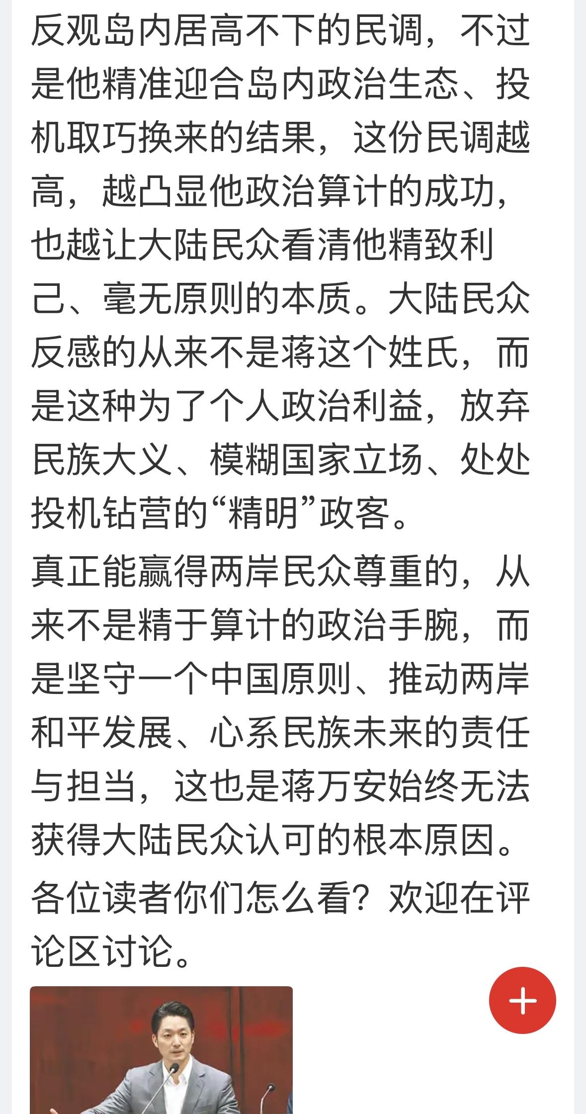 蒋万安在大陆口碑应该不错,你看他在双城论坛上的讲话,对上海赞不绝口,赢得了人们的