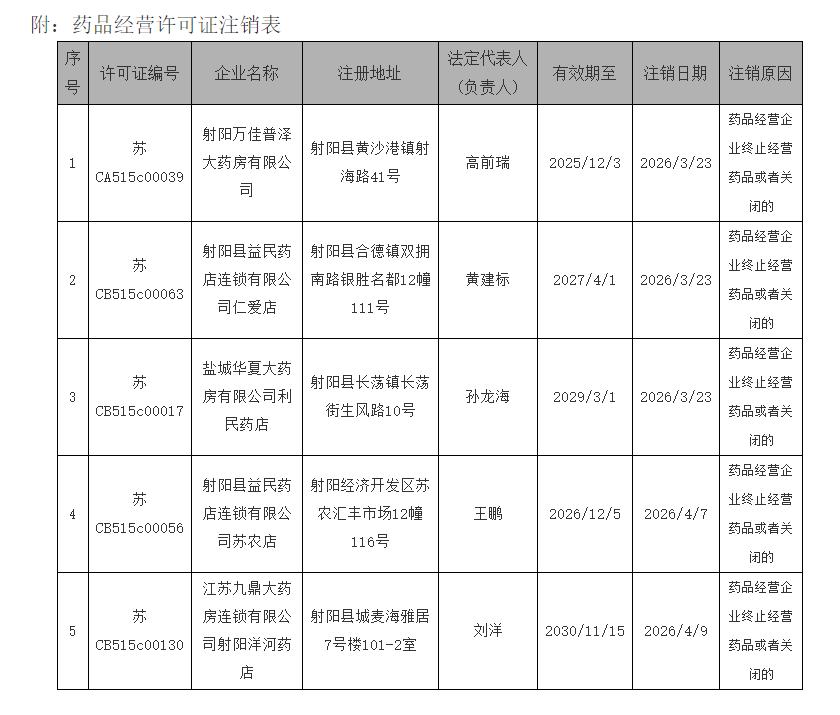 射阳发布《关于注销药品经营许可证的公告》,射阳万佳普泽大药房有限公司、射阳县益民药店连锁有限公司仁爱店、盐城华夏大药房有限公司利民药店、射阳县益民药店连锁有限公司苏农店、江苏九鼎大药房连锁有限公司射阳洋河药店现予注销!