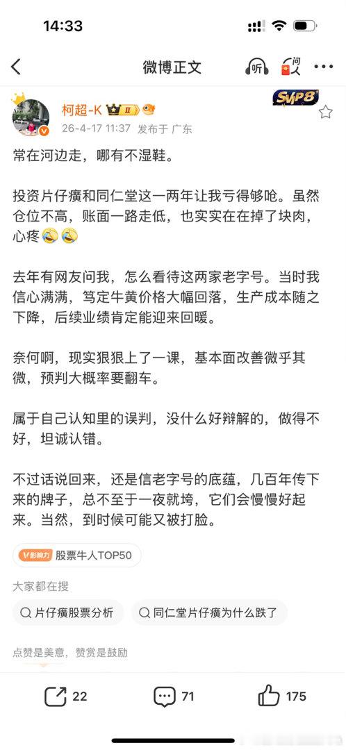 柯总都承认错误了,那乌龟也勇敢出来承认自己看走眼了,那些“贵州茅台、片仔癀、同仁