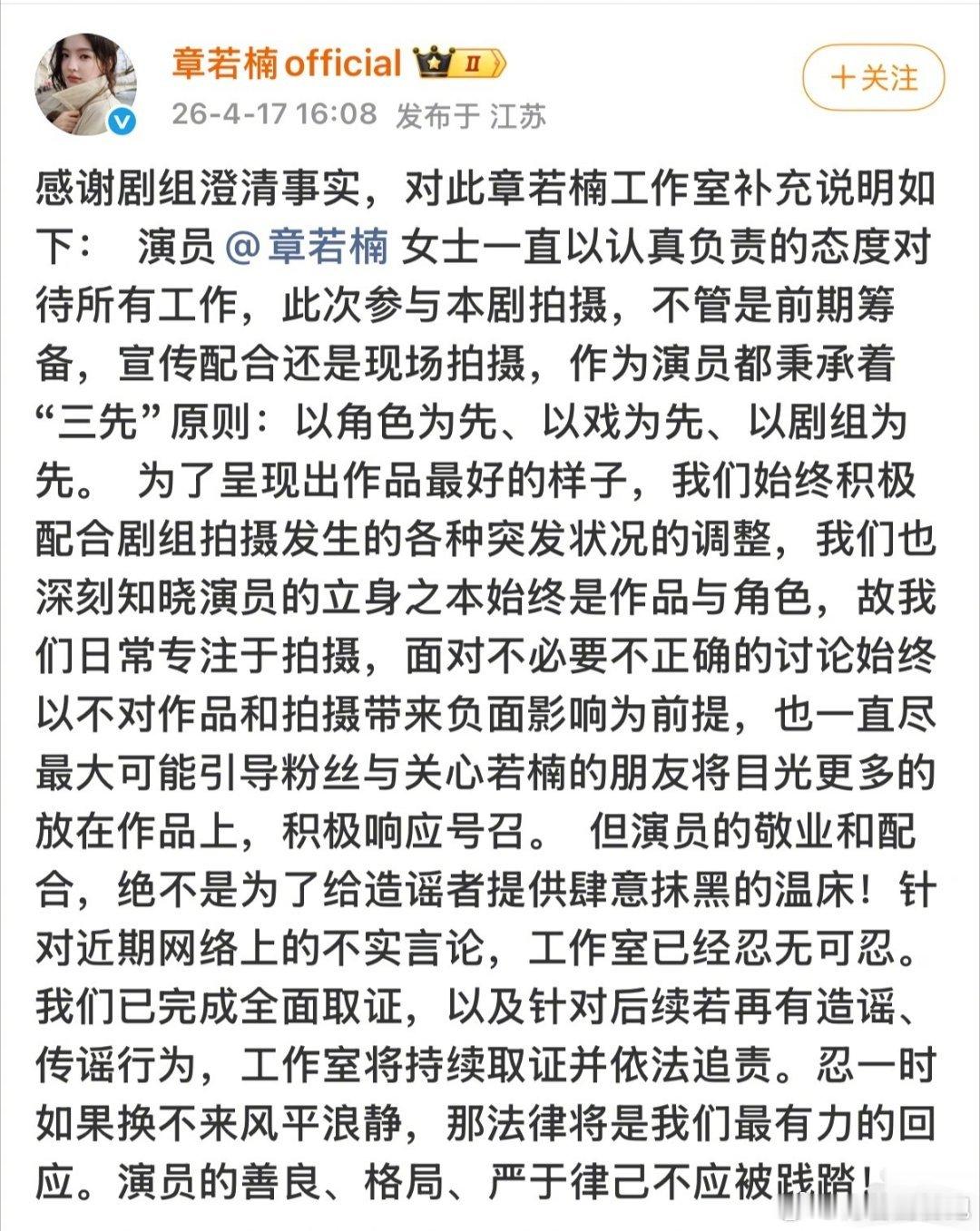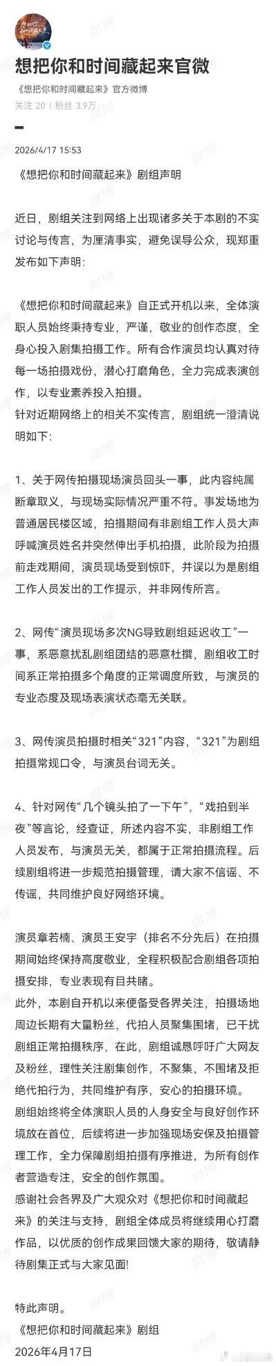 想把你和时间藏起来剧组声明《想把你和时间藏起来》剧组发声明回应了,章若楠真的无妄之灾,不要对女演员这么大的恶意了吧,一个视频就开始乱造yao