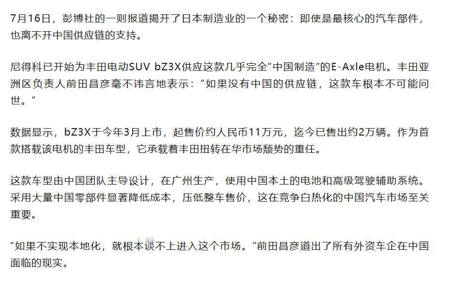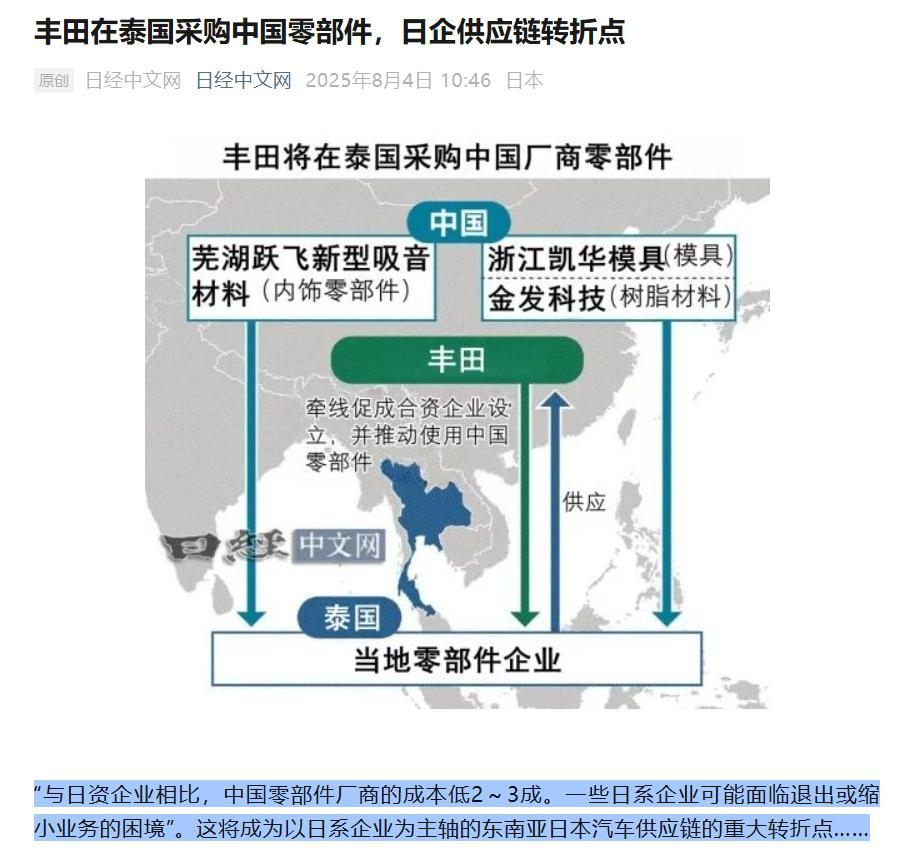 这对于中国来说也不是什么坏事,中国的供应链更深入打入这些国家汽车内部的话,对我国的制造业出海是很积极的,中国的供应链也可以借此绕开很多国家的关税壁垒。但对于日本来说,这种供应链转型的代价就太大了,日本很多行业都可以依赖中国的供应链完成升级,但这也就意味着,逐步放弃日本制造业的根基。