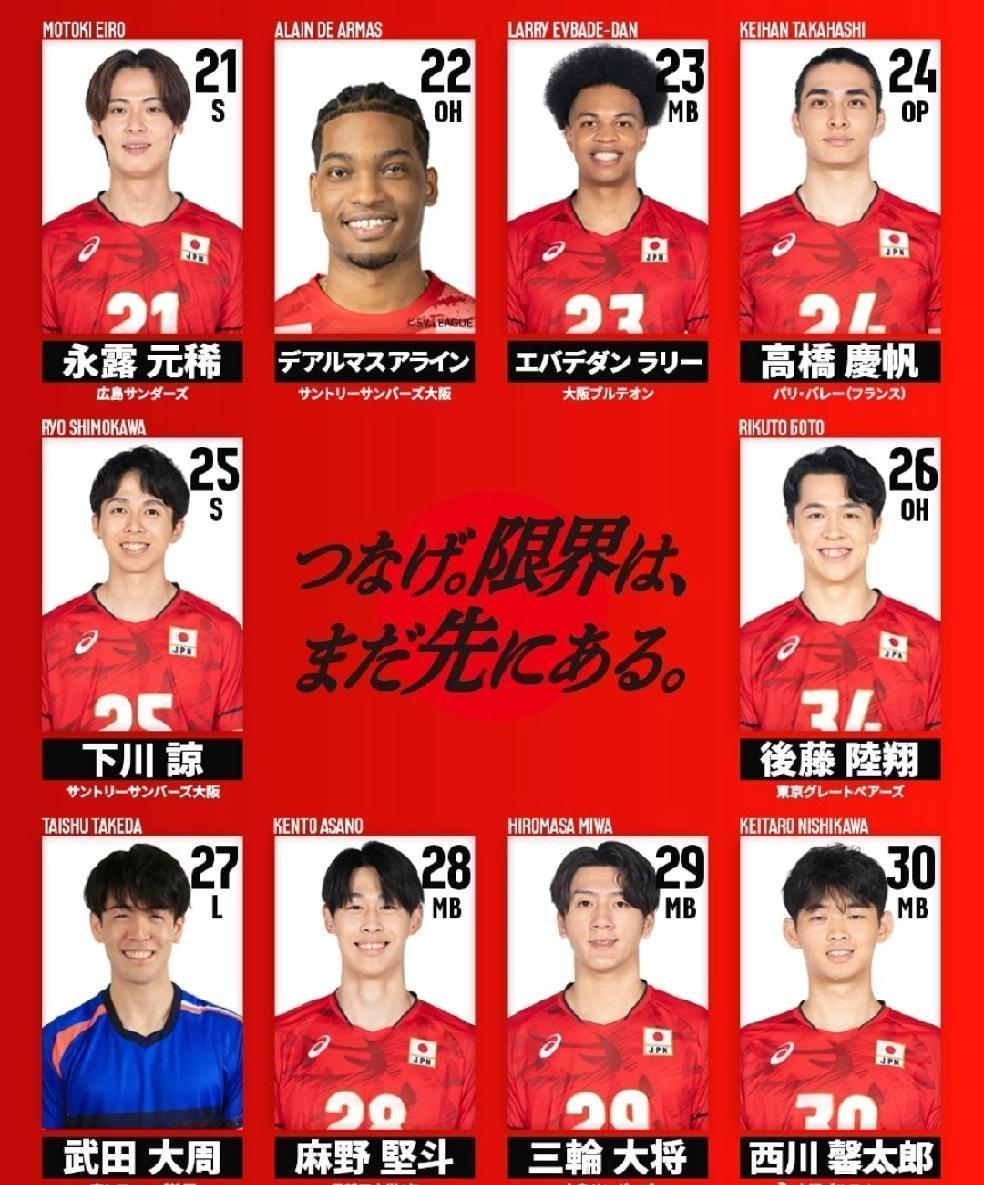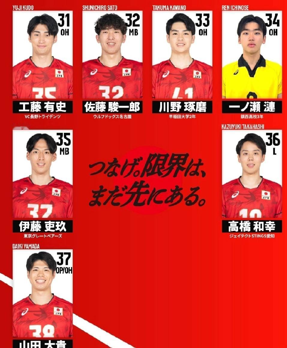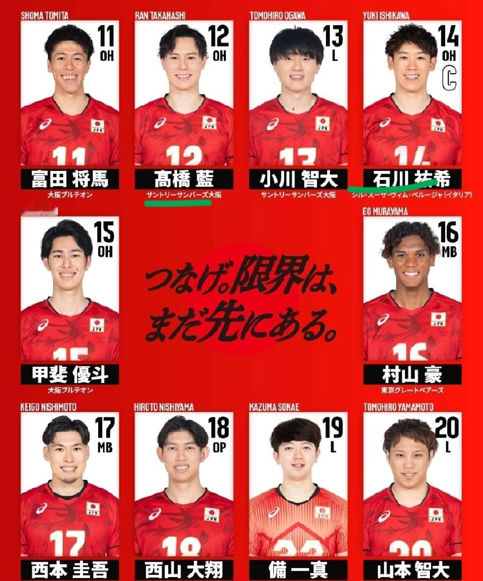 副攻11人:小野寺太志、山内晶大、高桥健太郎、村山豪、西本圭吾、丹.拉利、麻野坚斗、三轮大将、西川馨太郎、佐藤骏一郎、伊藤吏玖