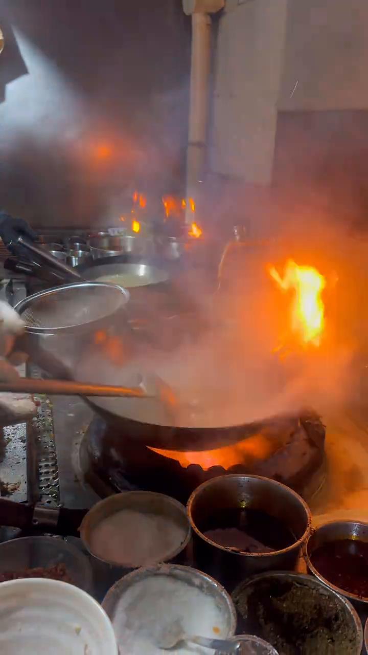 鲜艳饭店,20年老店,里边坐满了。太火爆了,给我来个爆炒小肠、薄荷排骨。这菜都在这摆着,想吃什么自己点。明厨明灶,都是现炒的。这个是什么菜?青椒牛肉沫。再来个热薄荷排骨拼烤肉。这家店可以,还可以拼。这太下酒了,有酒有肉。