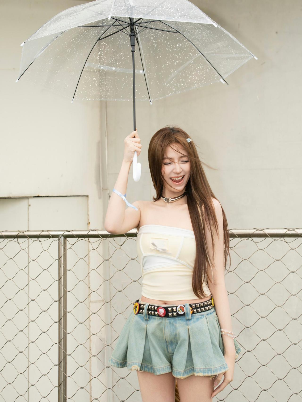 又甜又酷的Y2K辣妹风! 欧阳娣娣 抹胸短款上衣+牛仔百褶短裙,搭配复古运动