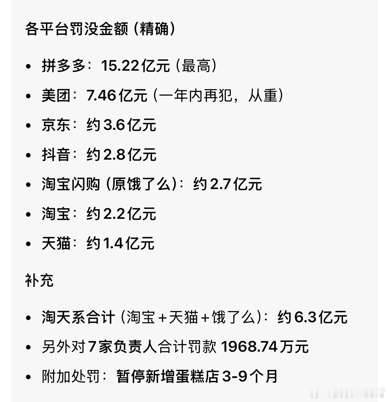 刺激,因为“幽灵外卖”的原因,拼多多美团京东淘天抖音被罚35亿,其中拼多多最高,被罚了15.22亿。可能有人不知道幽灵外卖啥意思,其实就是那些看似是正规堂食餐厅,但实际上是线下没资质、没堂食的外卖店,甚至营业执照都是P的,而平台睁只眼闭只眼不监管,所以说这波罚款应该没人不支持吧