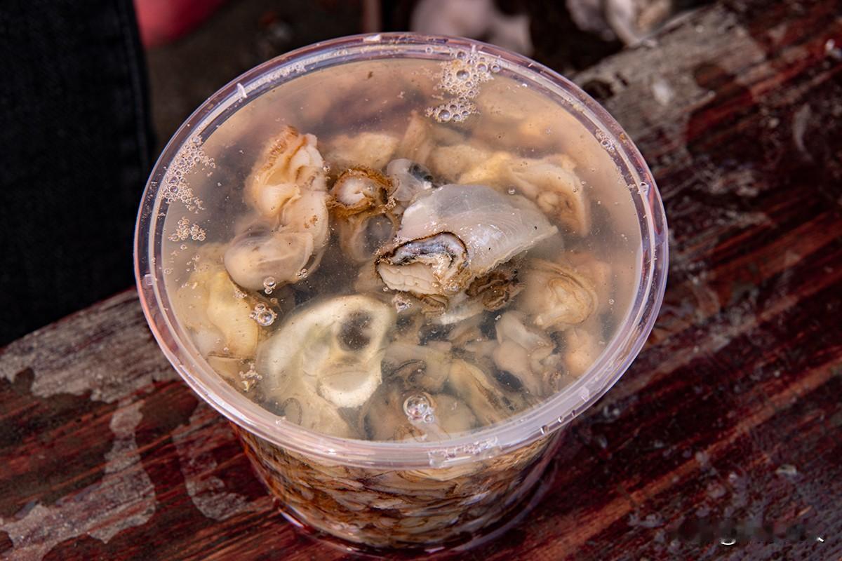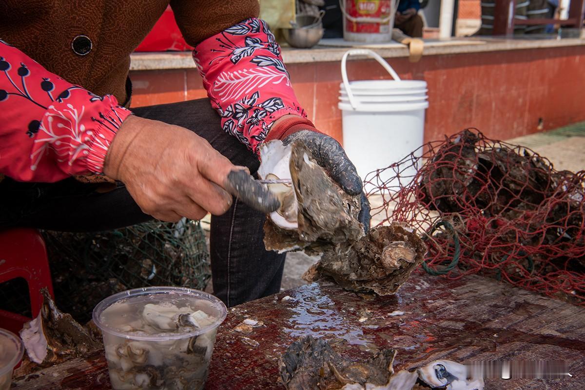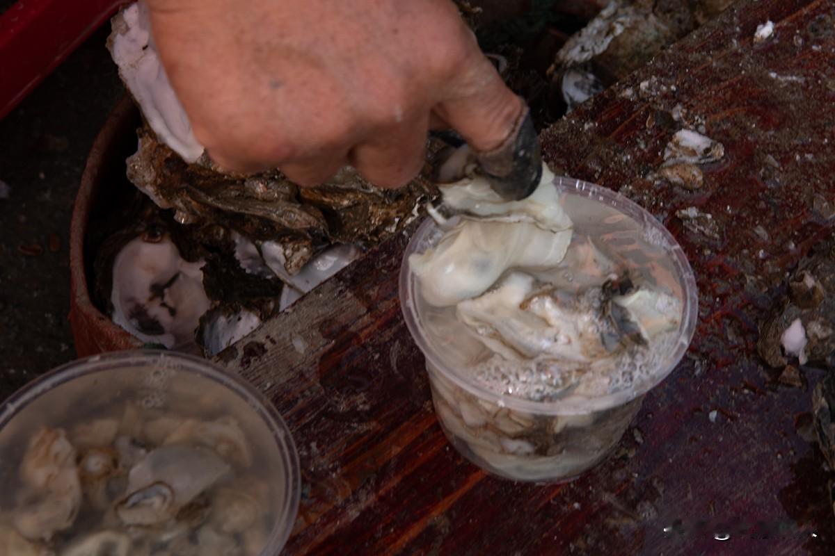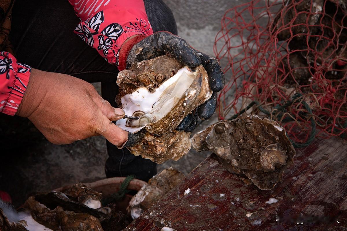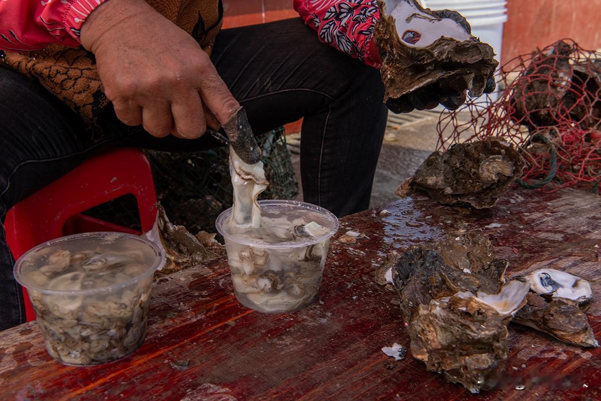 蚝情满怀 巧手执刀,壳隙轻启,肥嫩蚝肉应声而落。市集摊前,那双沾着