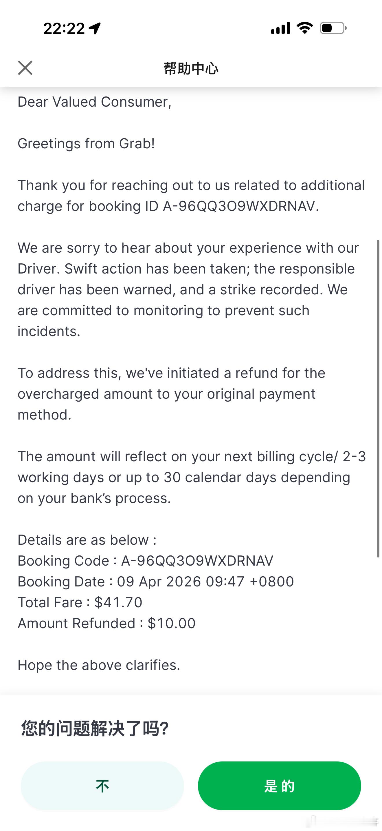 回国后记账回忆起来这件事,怎么都觉得不对劲,猜测这多收的10新应该是等候费之类的,但这难道不是司机没有零钱导致的吗为什么要消费者买单?立马一个邮件投诉。处理效率很高,退款,给予司机处罚,over,满意任何时候都不要放弃自己的消费者权益