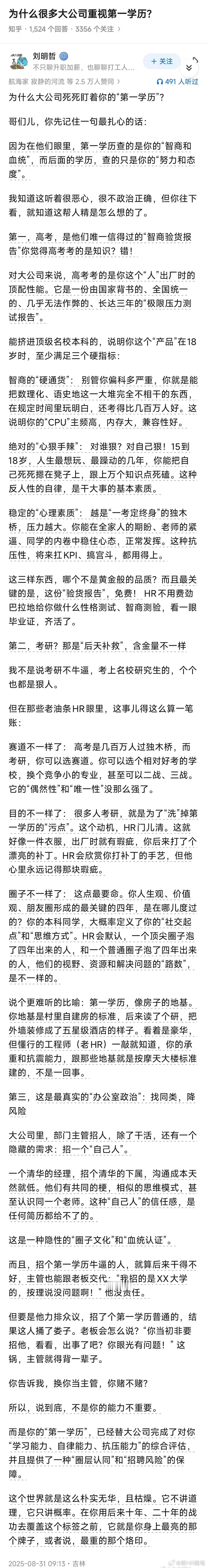 这个网友说的有道理,企业HR招聘最保险就是找双985或者双211,因为如果人才掉链子,那是个人问题。如果招聘了学历不行的,就会怀疑HR能力问题了。