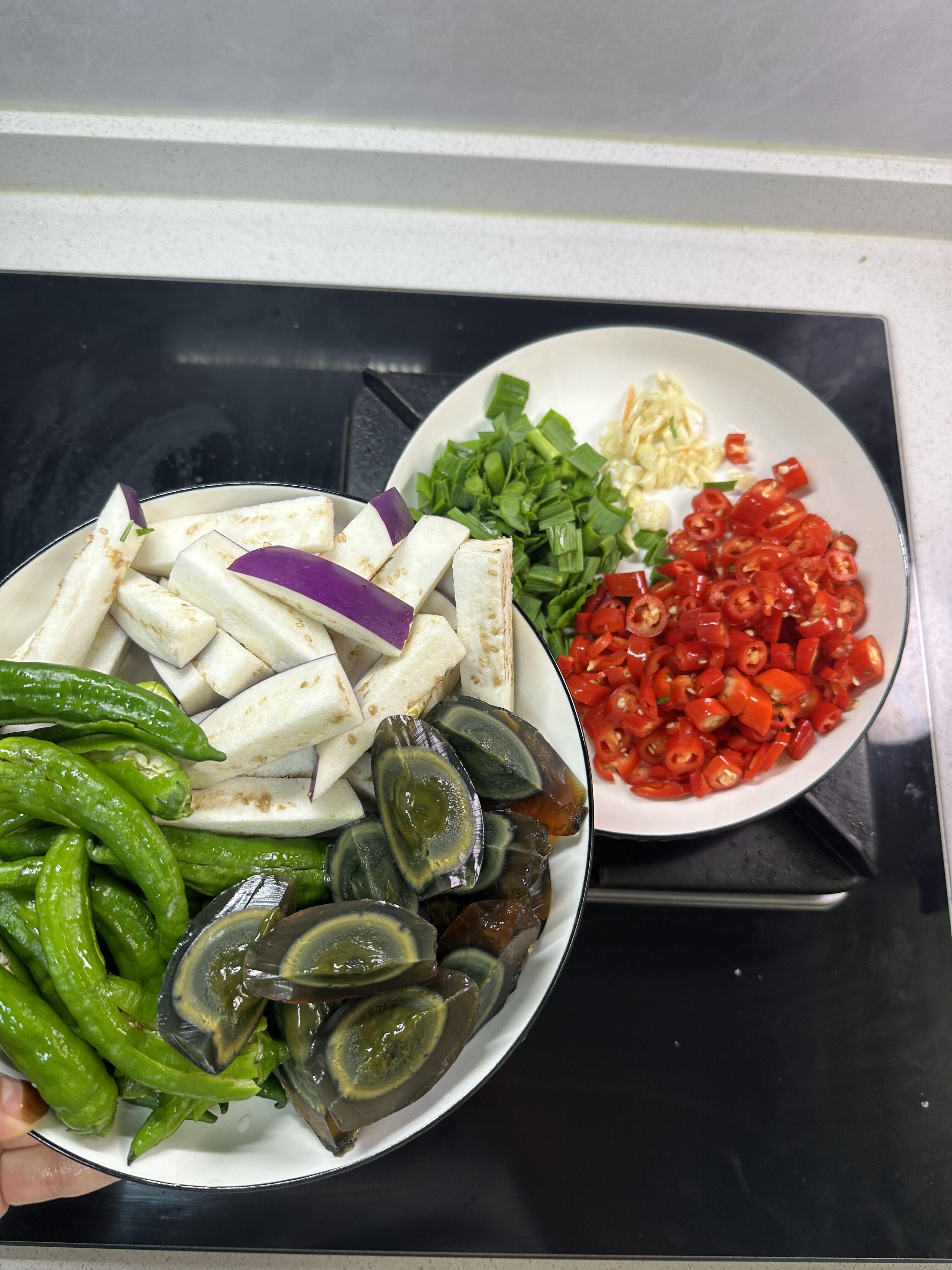 茄子、皮蛋、辣椒、蒜末、小米辣、豆豉、辣椒粉(不吃辣可直接省略)