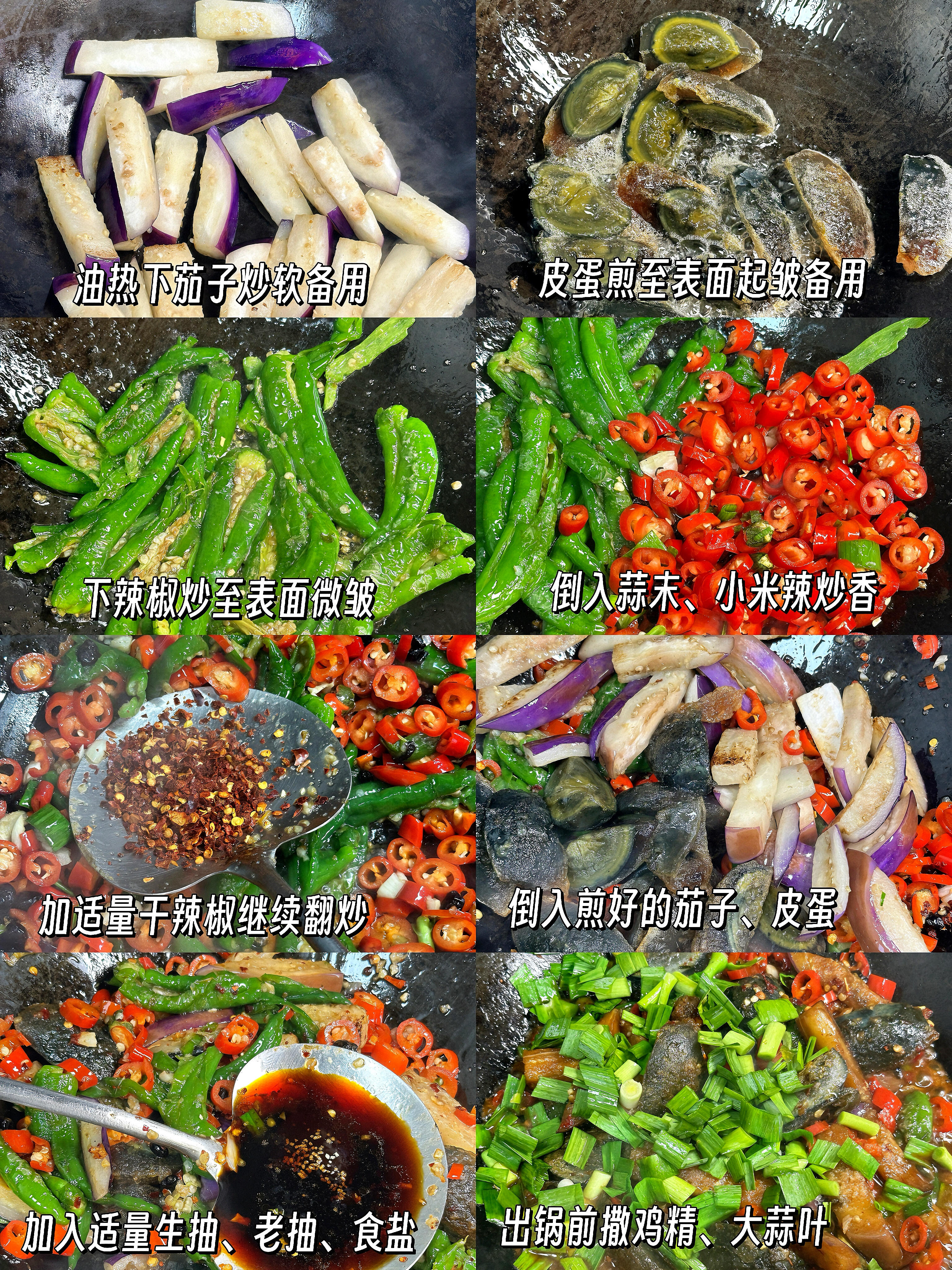 4. 混合翻炒:把之前炒好的茄子和煎好的皮蛋,一起倒回锅中,和辣椒、底料充分翻炒均匀,让每一块食材都裹上香辣气息