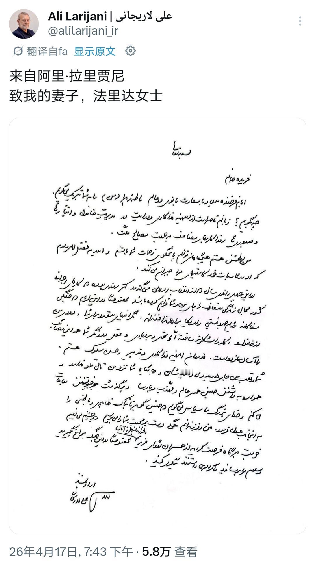 本文据称由阿里·拉里贾尼生前X账号发布,其真伪尚无法完全确认。若非本人绝笔,亦当出自深谙其为人、与其妻感情甚笃者之手。惟文中夫妻情深、死生相托之意,读来真挚动人,想必不虚。