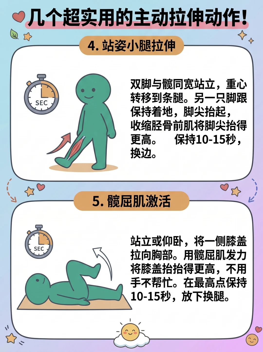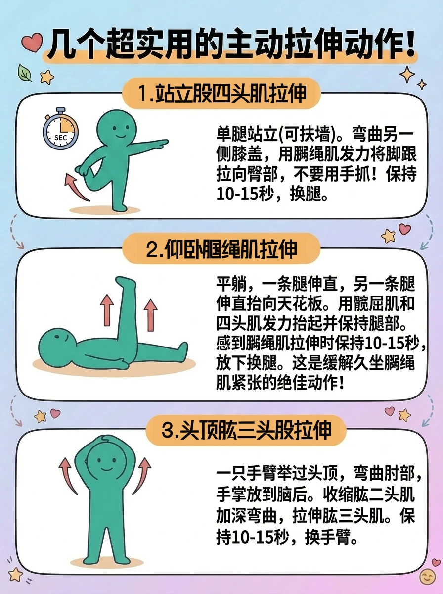 小贴士💡: 主动拉伸前不需要特别热身,但轻度活动后 (如散步) 效果会更好。建议每周至少 3 次,每次针对目标部位花 10-15 分钟。