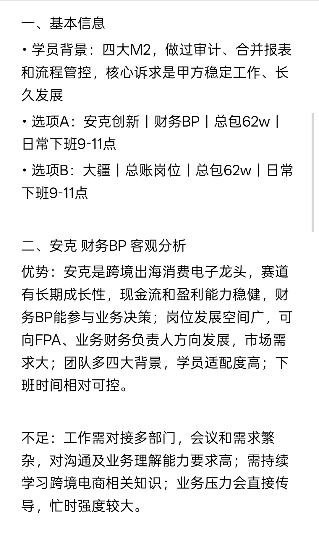 • 选项A:安克创新|财务BP|总包62w|日常下班9-11点