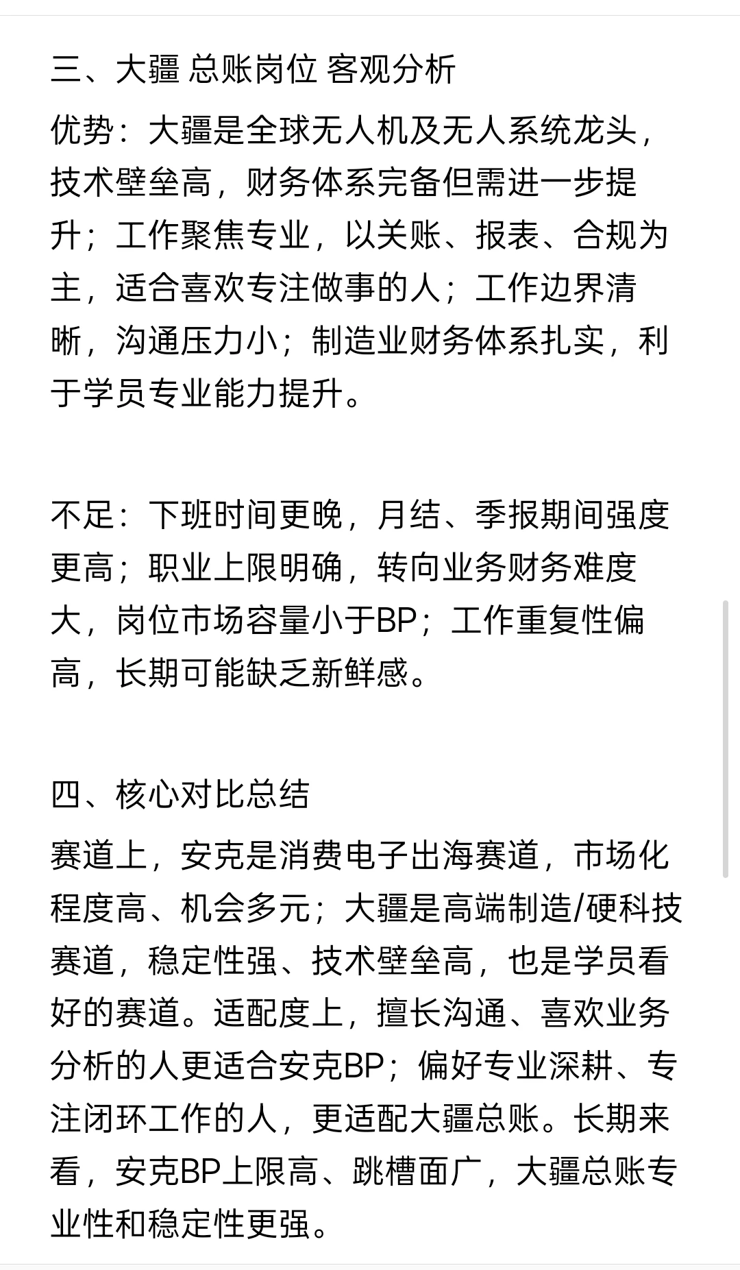 赛道上,安克是消费电子出海赛道,市场化程度高、机会多元;大疆是高端制造/硬科技赛道,稳定性强、技术壁垒高,也是学员看好的赛道。适配度上,擅长沟通、喜欢业务分析的人更适合安克BP;偏好专业深耕、专注闭环工作的人,更适配大疆总账。长期来看,安克BP上限高、跳槽面广,大疆总账专业性和稳定性更强。