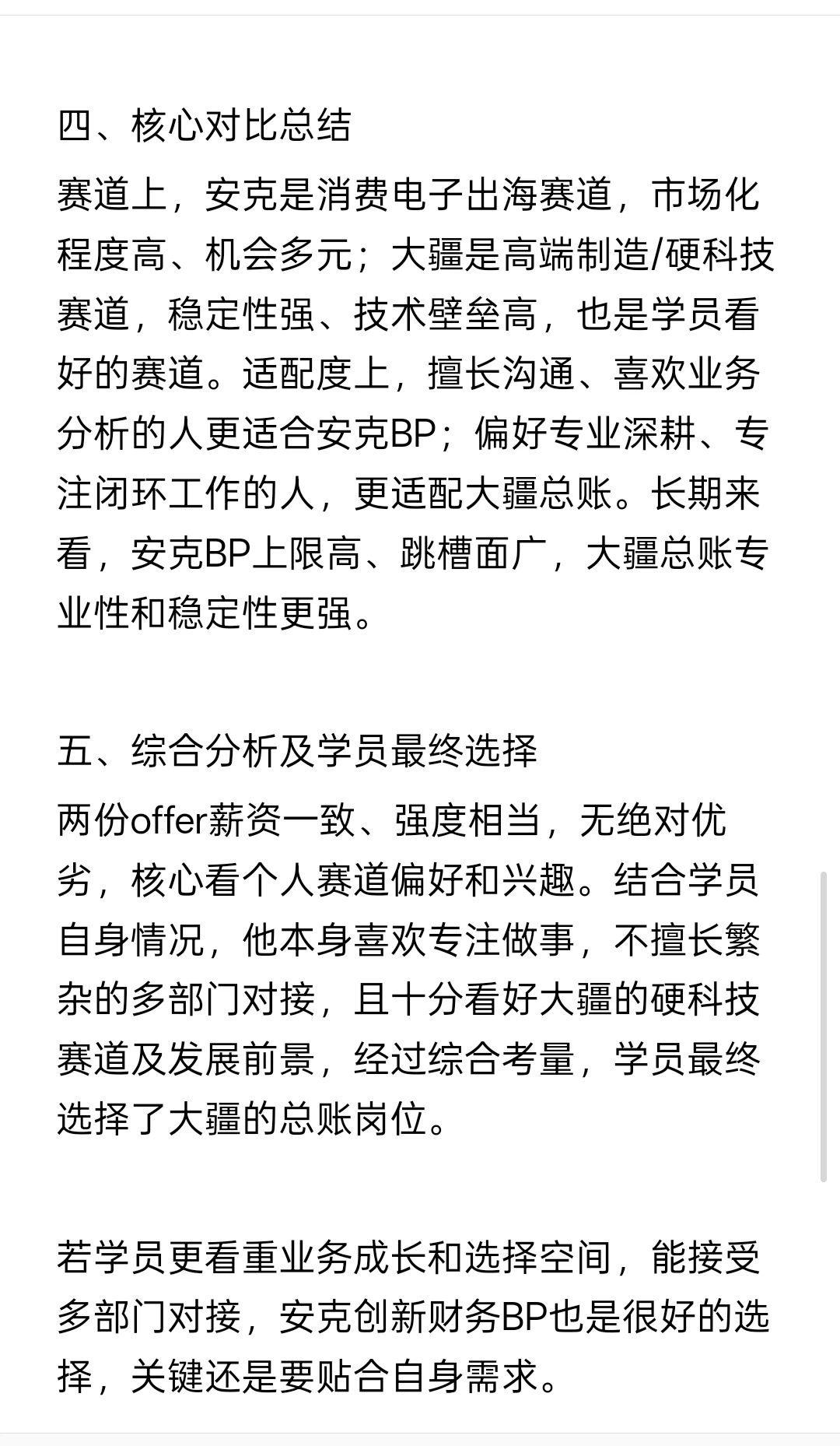 两份offer薪资一致、强度相当,无绝对优劣,核心看个人赛道偏好和兴趣。结合学员自身情况,他本身喜欢专注做事,不擅长繁杂的多部门对接,且十分看好大疆的硬科技赛道及发展前景,经过综合考量,学员最终选择了大疆的总账岗位。