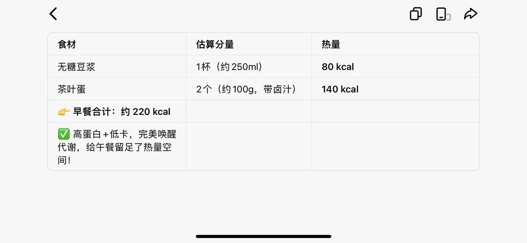 ✅ 早餐:豆浆+茶叶蛋2个(7点)