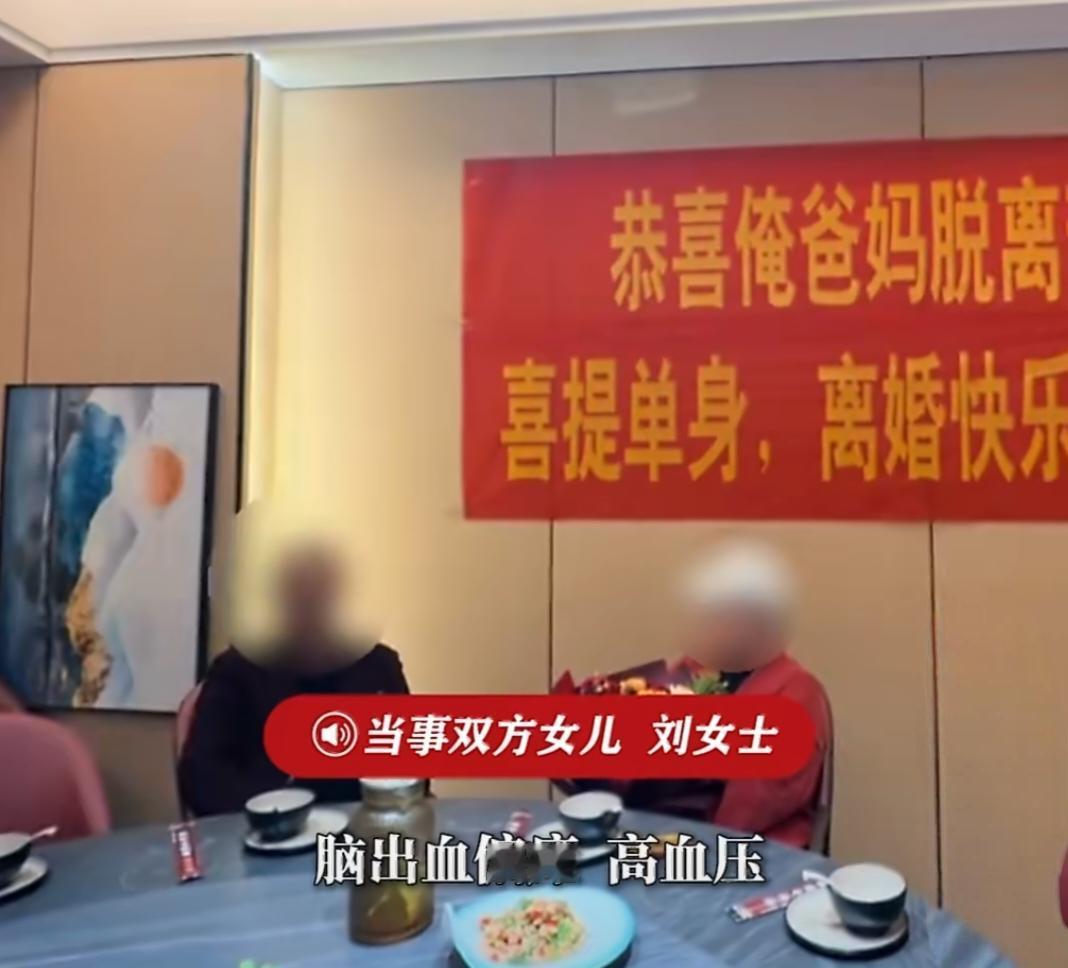 4月17日,女儿刘女士专门摆了酒席,拉起大红色的横幅,写着“恭喜俺爸妈脱离苦海,喜提单身,离婚快乐!”,笑着给爸妈庆祝。这画面,一开始看让人有点懵,可了解背后的故事,瞬间就破防了。