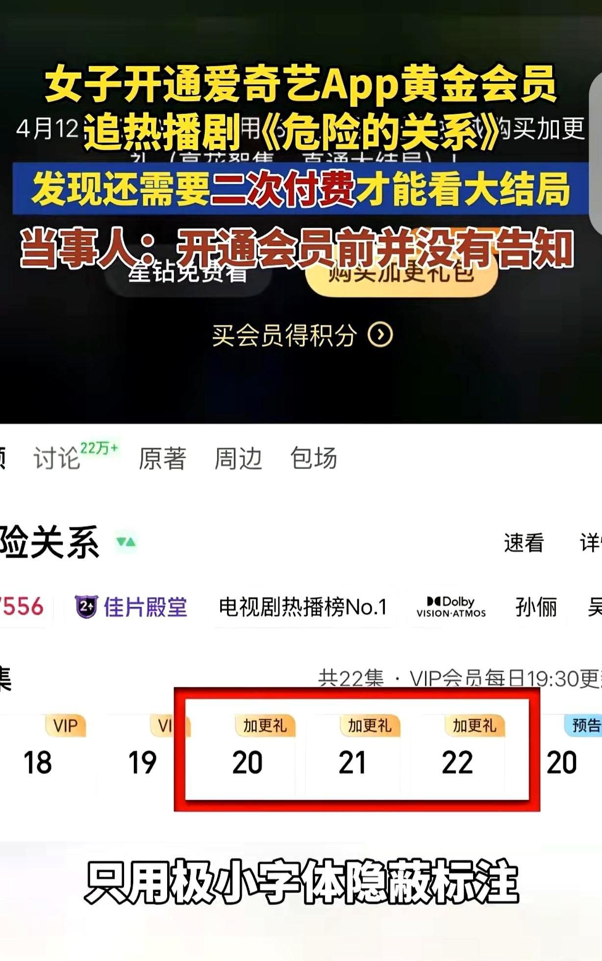 “套路防不胜防!”湖北武汉,一位女性追剧遇上了付费陷阱。为了赶看一部22集的网剧,她咬牙开通了某视频平台的黄金会员。追到第19集时,剧情正卡在关键处,平台却弹出提示:想看最后3集,要购买“加更礼”,单集18元,三集打包60元,付费后可在4月12日7点30分前提前解锁大结局。林女士气得不行:开通会员前为什么不说明结局还得另外付钱?会员竟然还要二次收费,这算哪门子会员?