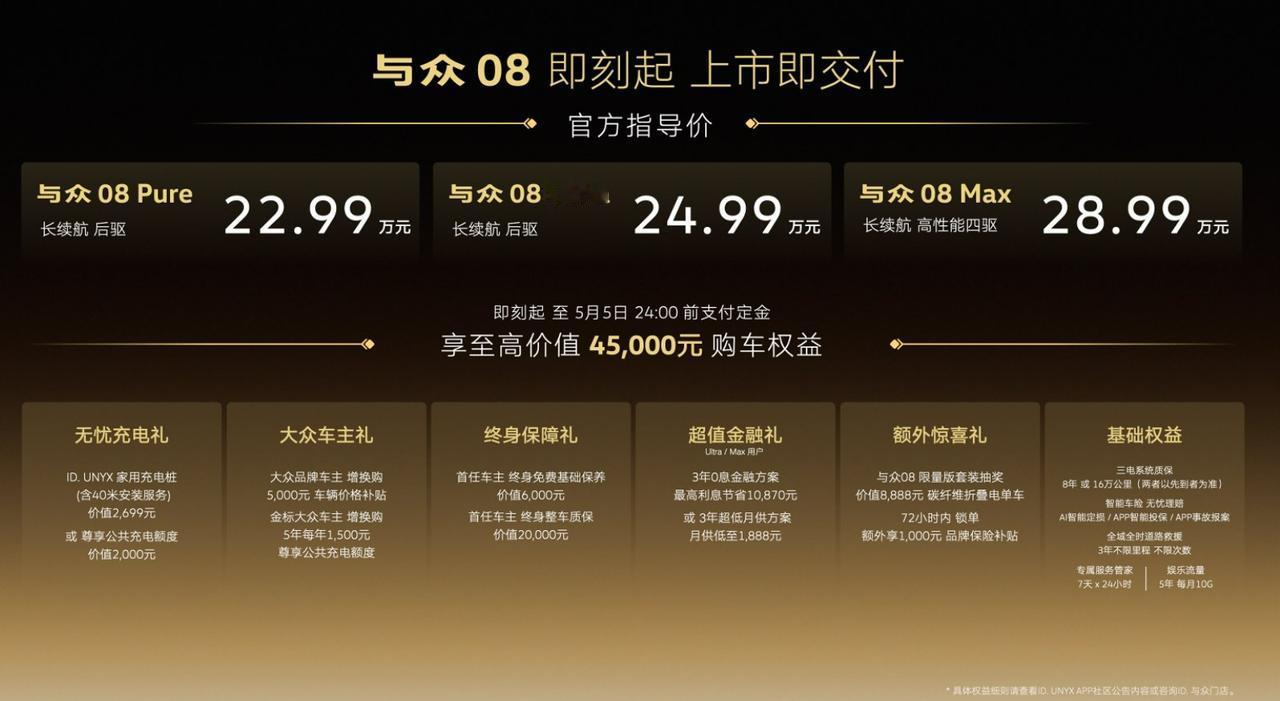 4月16日,与众08上市,新车是大众安徽汽车旗下全新纯电SUV,新车共推出3款配置车型,售价22.99-28.99万元。具体来看,新车采用了大众汽车全新的设计语言,前脸配备由400多个可独立控制LED灯珠组成的隐藏式矩阵大灯,支持交互式灯光效果自定义,车身尺寸方面,新车长宽高分别为5000/1954/1688mm,轴距3030mm,整车侧面来看呈现短前悬、长后悬的布局,尾部配备宽厚的车顶扰流板装饰,并配备隐藏式的后雨刷器。车内配备10.25英寸全液晶仪表、为双14.96英寸2.4K超高清智能双联屏,搭载高通骁龙SA8295P高性能座舱芯片,车机搭载AI智能伙伴。舒适性配置上,新车提供女王副驾、可调光全景天幕、车载冰箱等。动力上,新车基于800伏平台打造,搭载高性能800伏碳化硅电驱系统,提供单电机后驱与双电机四驱版本。单电机版最大功率230kW;双电机四驱版前电机140kW、后电机230kW,电池为宁德时代磷酸铁锂电池,提供82kWh/95kWh两种容量,82kWh电池续航为630km,95kWh电池CLTC续航最高730km/700km。【来自懂车帝车友圈】