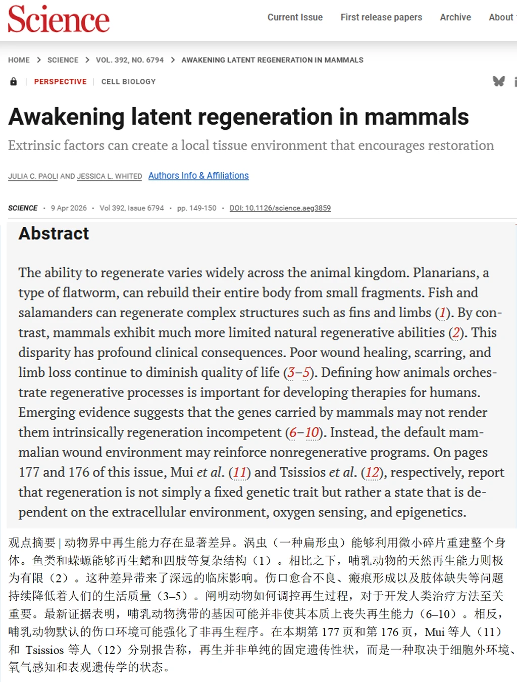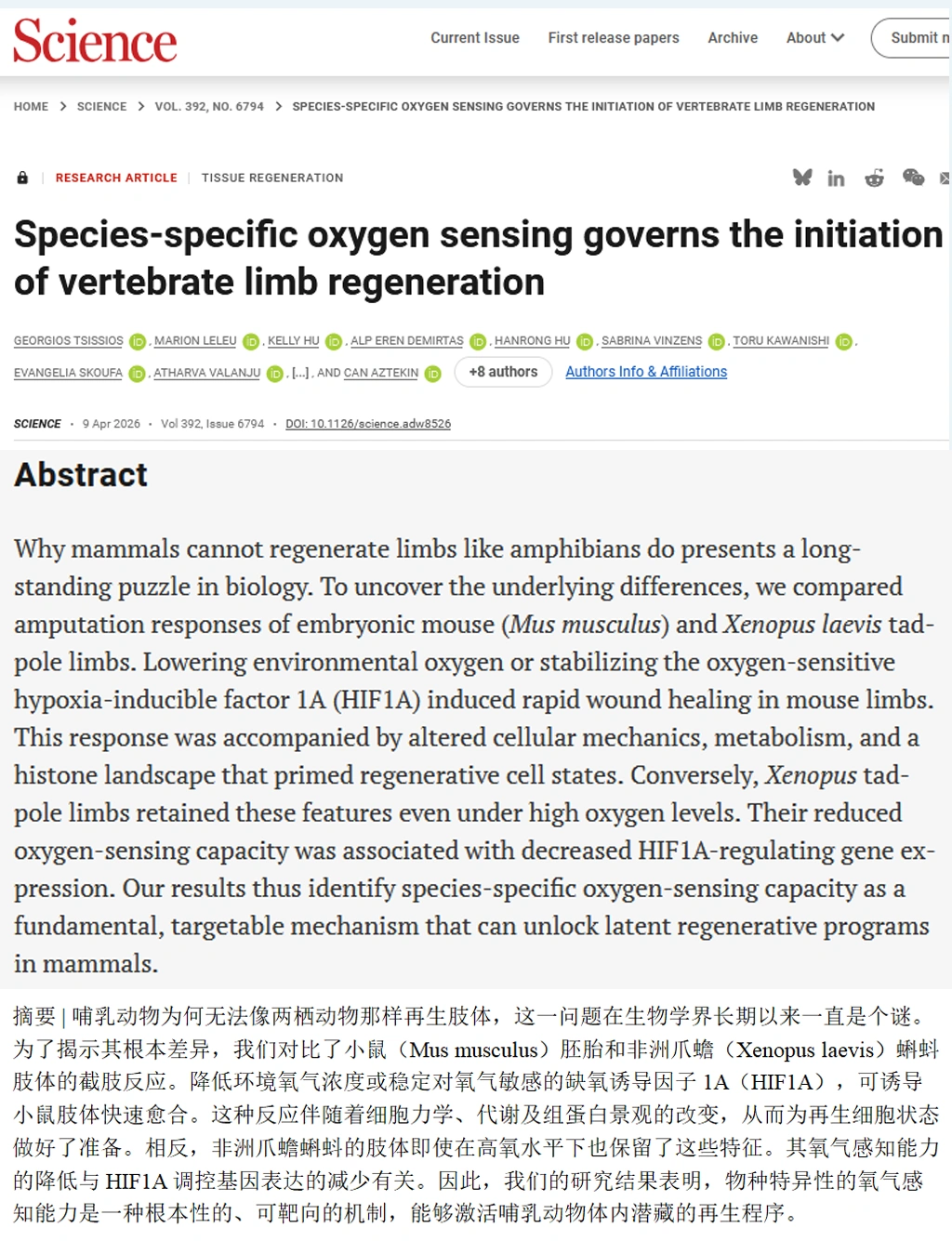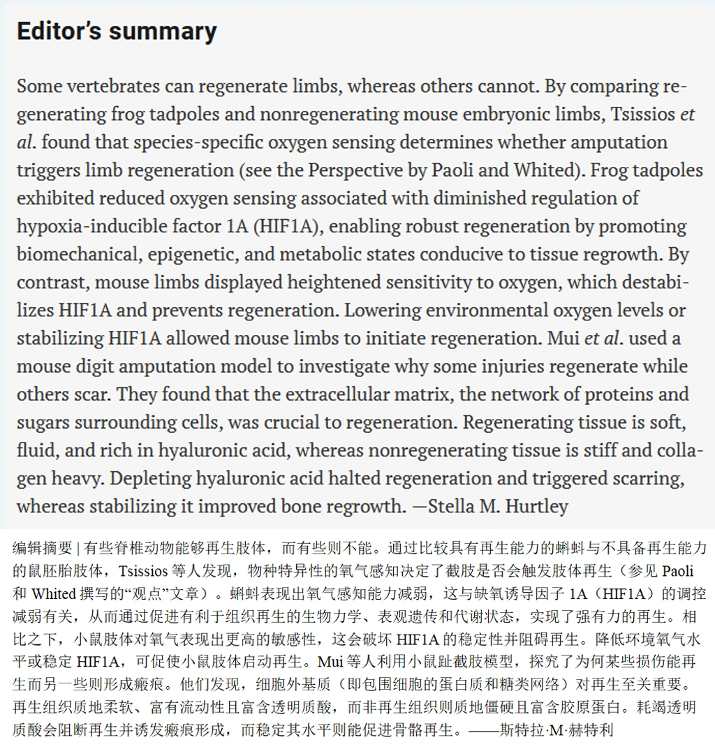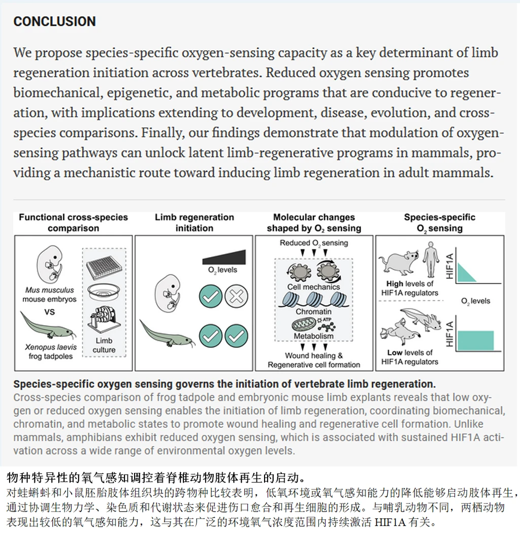 哺乳动物的再生能力没有被删除,只是被两套系统压制了:一套是伤口愈合时疯狂堆砌胶原蛋白的本能,另一套是氧感知系统对再生的“刹车”。两套系统本来是为了快速止血防感染,代价是永久性地失去了重建组织的机会。这两套系统都是可以被干预的。让组织变软,或者让氧气浓度降下来,疤痕模式就能切换回再生模式。人类肢体再生的可能性,由此被重新摆上了桌面。