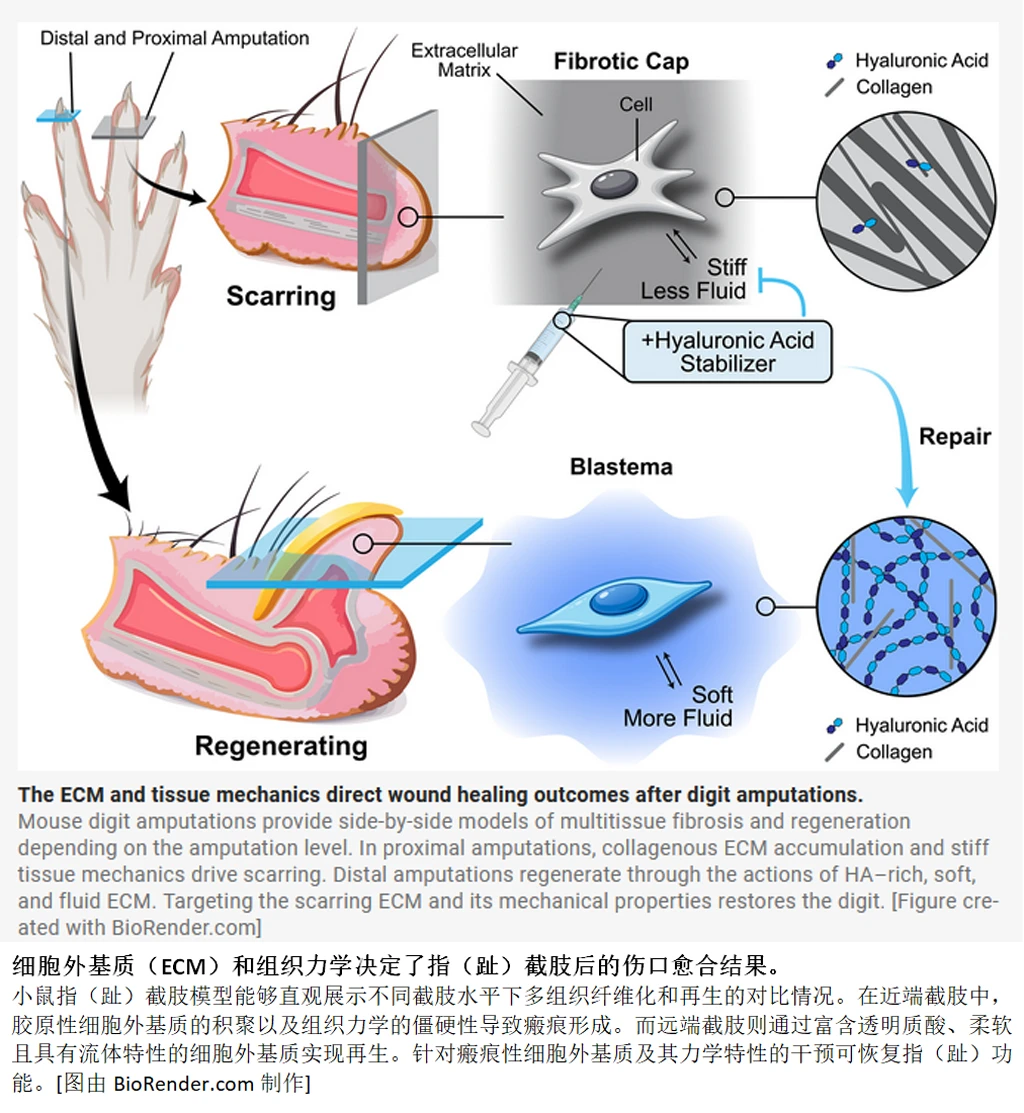 第一项研究从小鼠说起。小鼠的指尖有个奇怪的特点:从最尖端切掉,骨头、血管、神经全能长回来;往上挪两毫米,同一根指头,同样的切法,只会结疤。研究人员把两块组织放到显微镜下比较,发现了一个肉眼可见的差异——硬度。