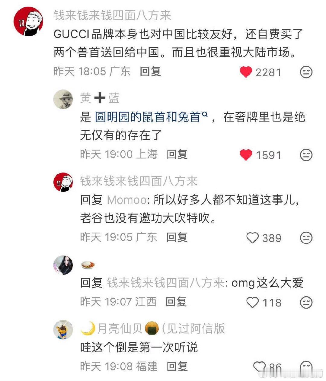 原来开云和Gucci一直对咱这么友好不仅自费买下圆明园两个兽首,无偿捐赠给咱们,