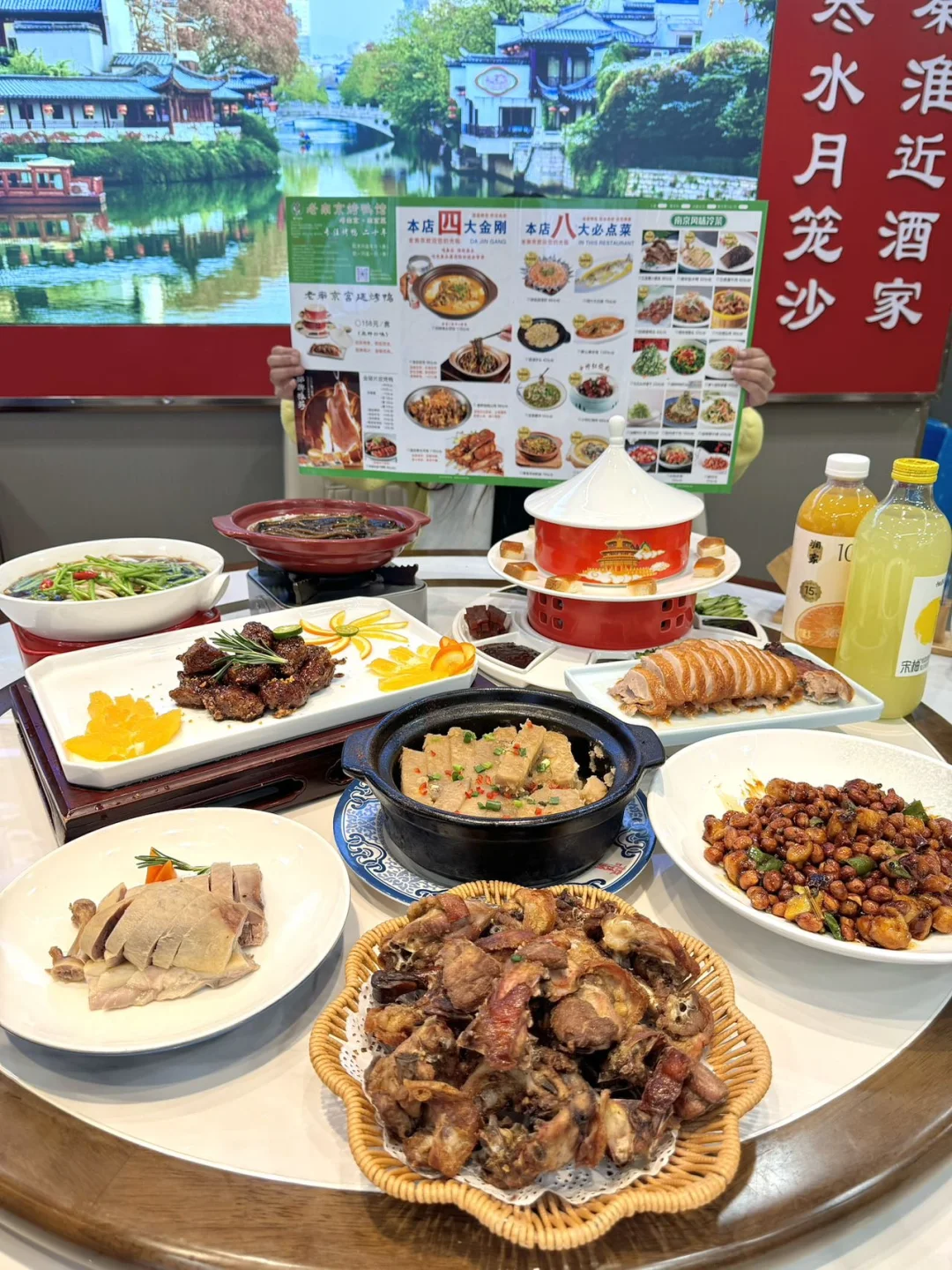 玄武湖逛完刚好正餐,就近吃地道南京本帮菜!招牌金陵烤鸭外皮油亮、肉质细嫩,蘸酱卷饼超地道;还有红烧五花肉、招牌鱼头泡饭、手工狮子头,菜品地道不踩雷,邻湖环境舒服,闭眼点不踩雷。