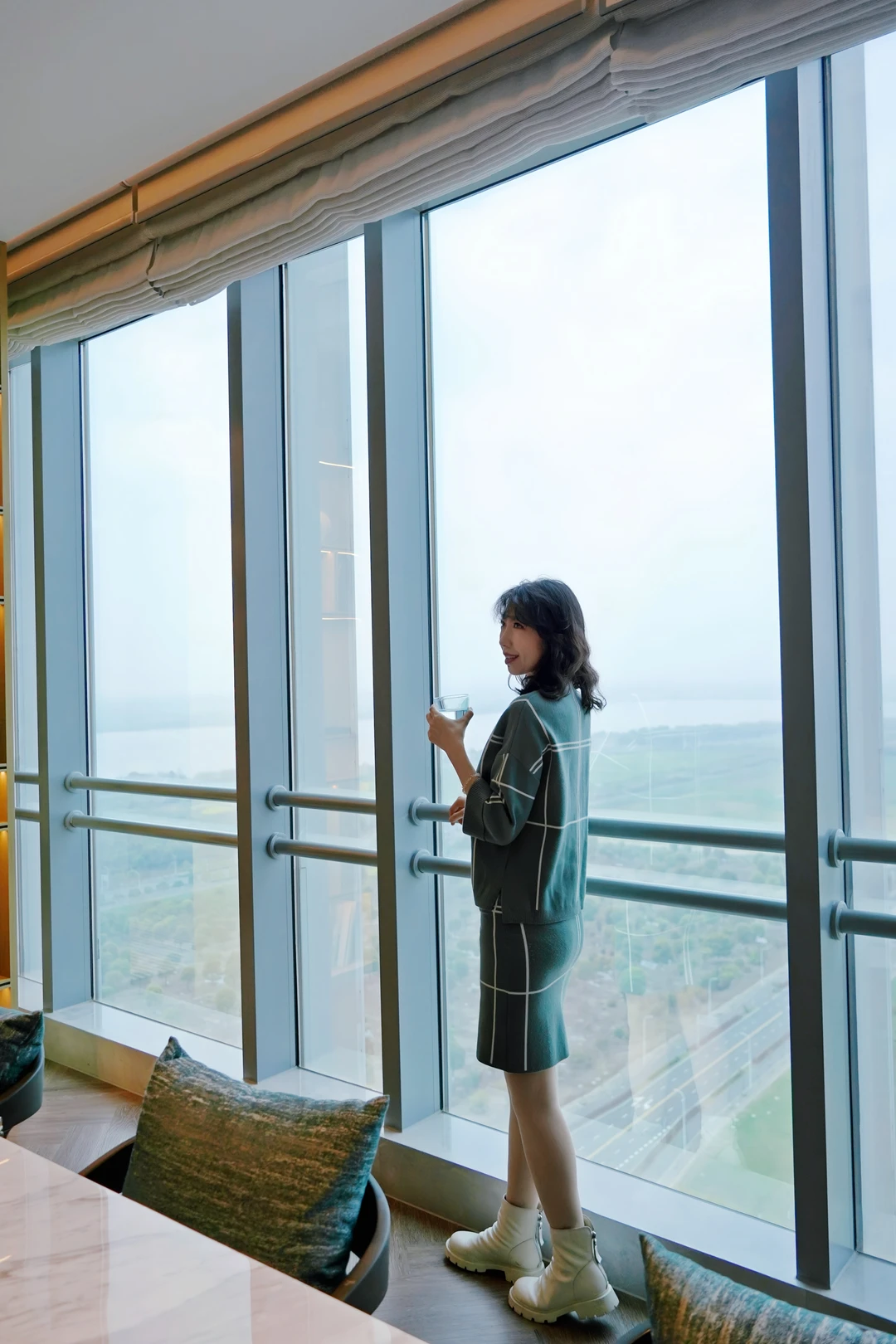 在落地窗前凭窗俯瞰