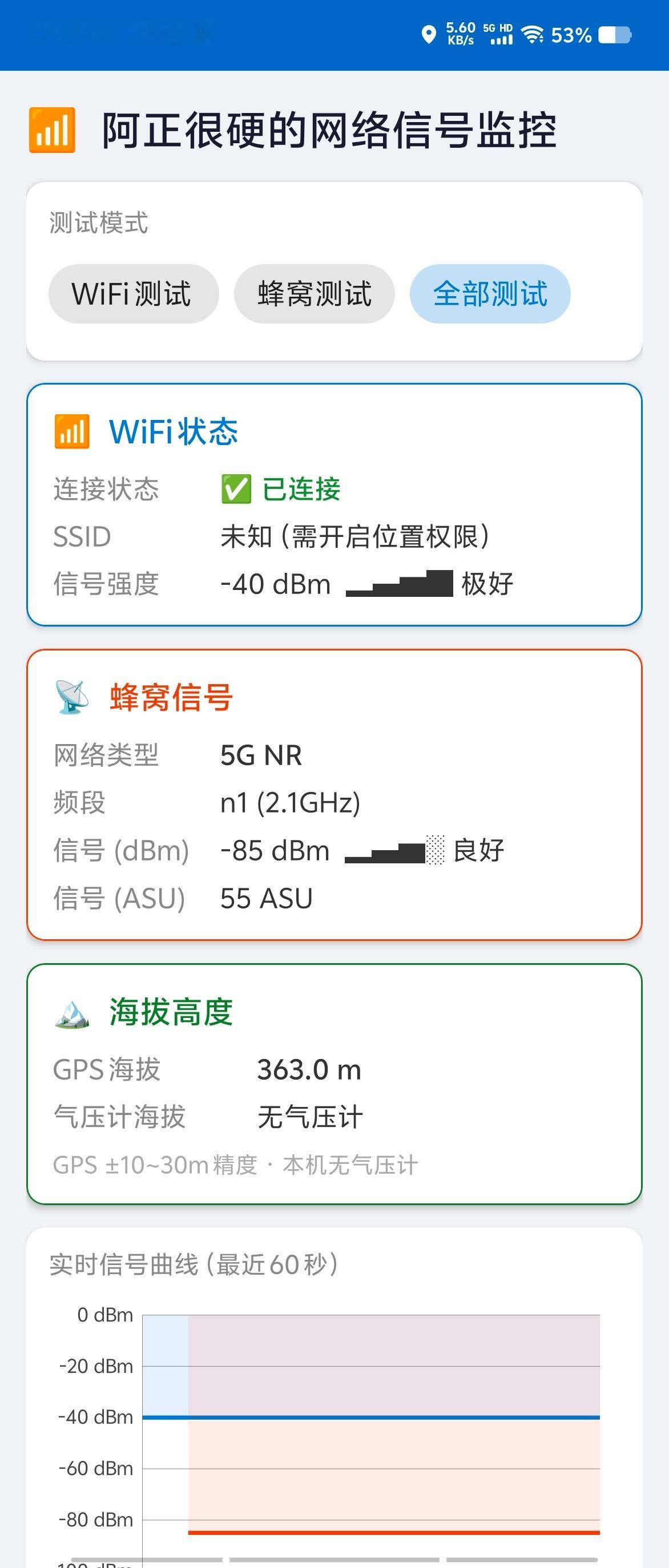 阿正很硬蜂窝网络wifi网络监测版本V5更新,修复了采集频率,修复了频段显示,新增了海拔采集,修复了文本记录功能!