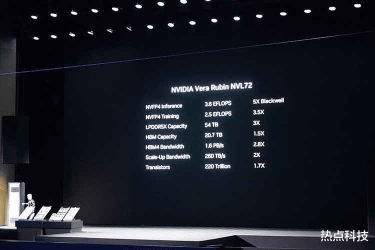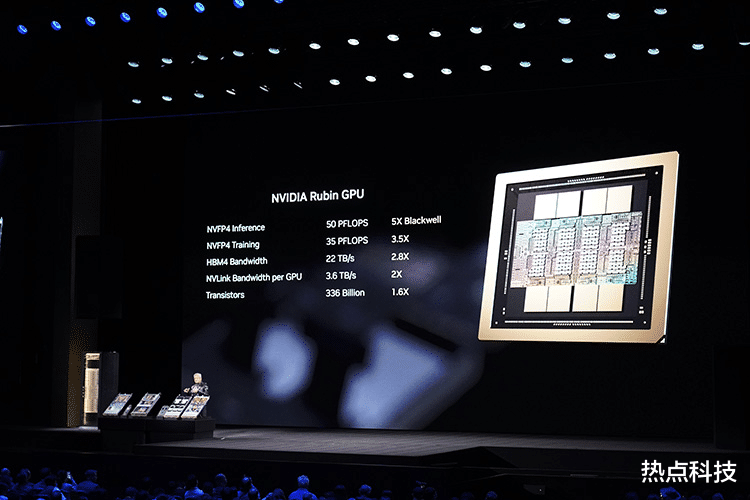 其最重要的核心部件就是新一代的全新Rubin GPU,它搭载了8颗HBM4超高速显存,以及3360亿个晶体管的规模,并升级了第三代 Transformer 引擎,综合之下在NVFP4的推理能力上可达到50 PFLOPS,做到了前代Blackwell的5倍算力,训练能力也达到了35 PFLOPS,是前代的3.5倍,整体性能提升实现了飞跃。