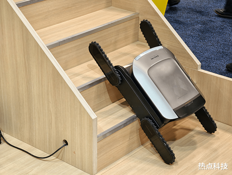 我们还在现场看到了曾在去年IFA亮相过的爬楼机Cyber X,和上一次相比,它的性能又有了一些新升级。现在它能爬上最高35cm的台阶,移动速度也做到了最快0.2m/s,爬一层楼只需要27秒。它特有的三段式履带对于楼梯的适应性很强,直梯、弧形梯等等楼梯都可以流畅攀爬,可攀爬坡度也达到了42°。