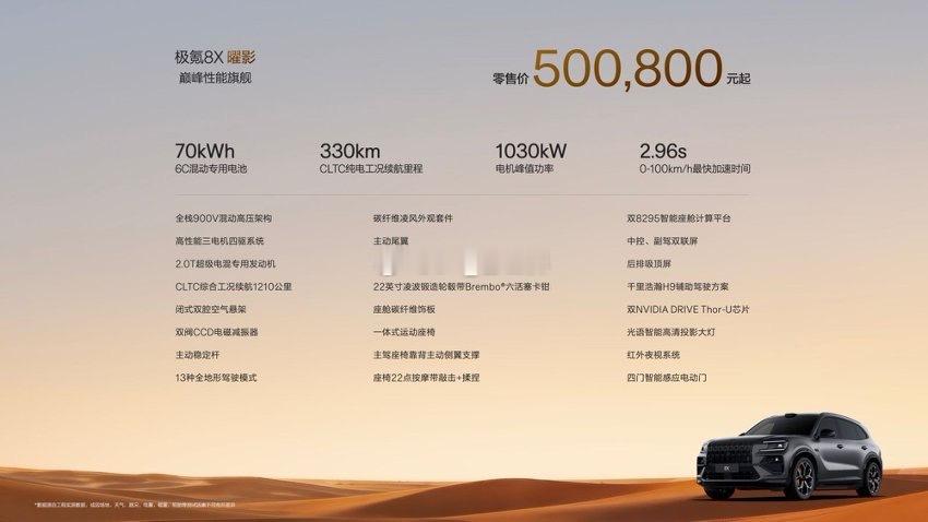 900V高压混动、6C电池、2.0T增程——极氪这次把"既要又要"玩明白了:想要性能?给你1030kW三电机。想要续航?混动架构兜底。之前总有人说国产高性能是伪命题,8X算是用行动回应了。