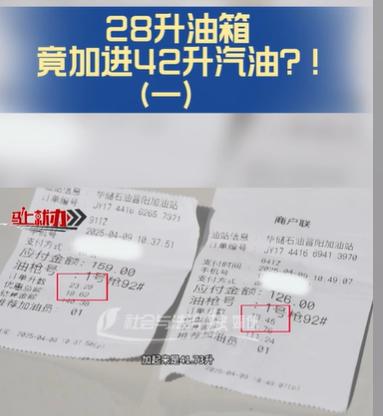第一次加注23.28升,第二次加注18.45升,两次合计41.73升,男子丁先生得知后看着加油账单心生疑虑,28升的油箱怎么可能装下41升多的汽油,当即怀疑加油站在计量上存在作弊行为。