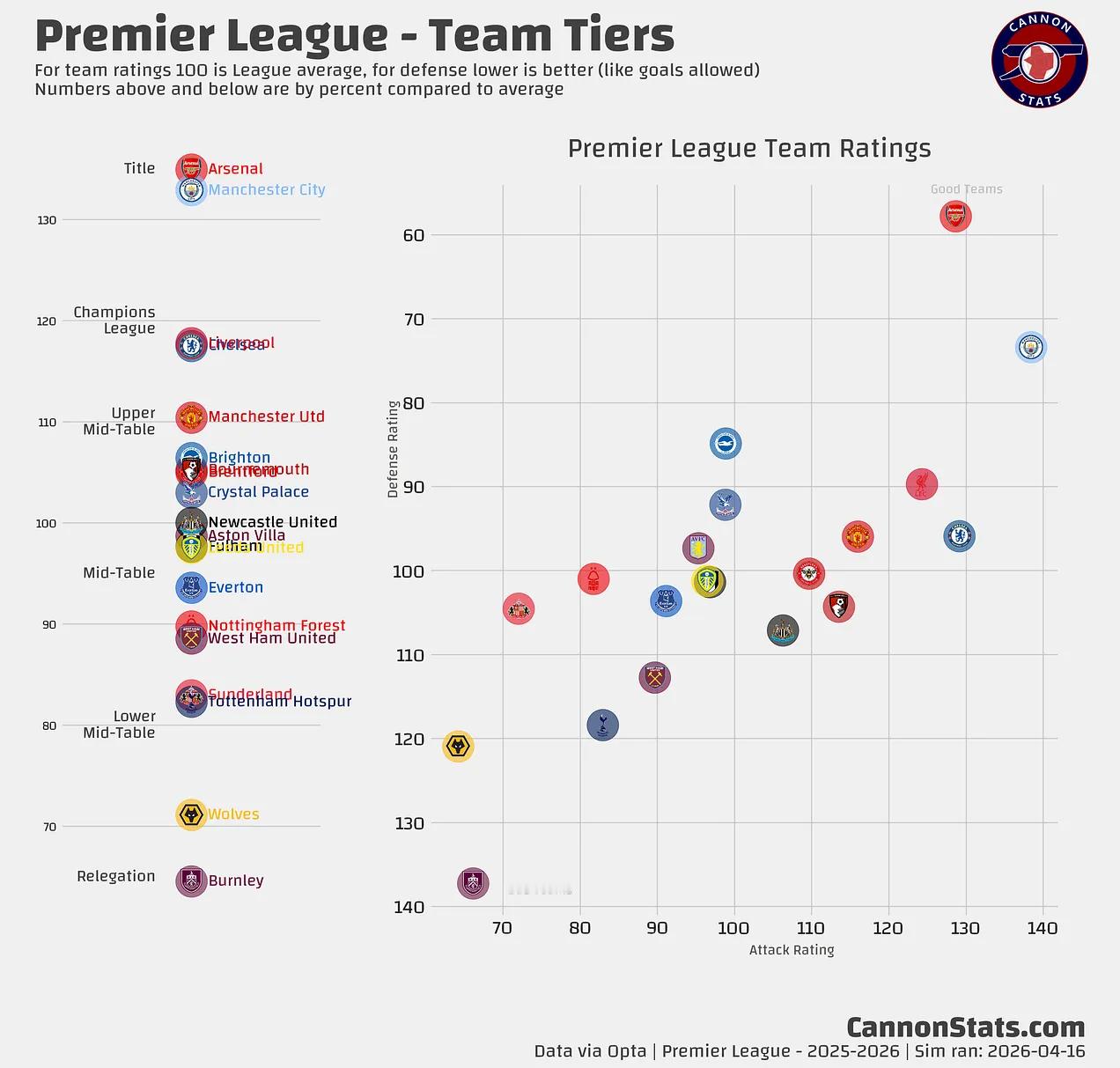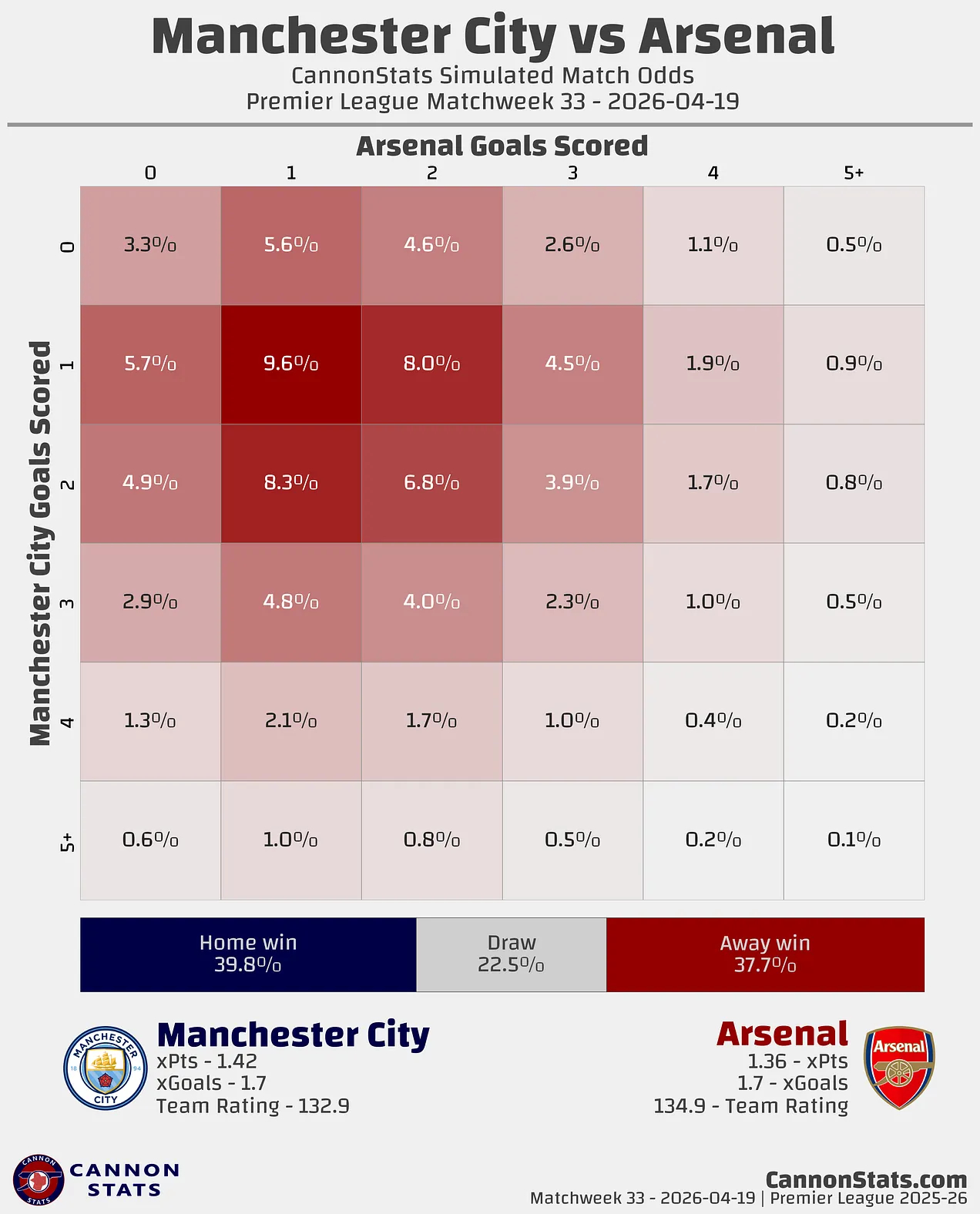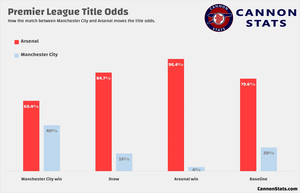 最新的超级计算机模拟结果显示,阿森纳的夺冠概率高得令人不安,达到79.6%。即使输球,阿森纳和曼城的理论最高积分(如果都赢下剩余比赛)将持平于85分,但我的模型在那种情况下仍会略微看好阿森纳。这显然没有考虑本场比赛可能给两队带来的信念、信心变化或其他无形因素。