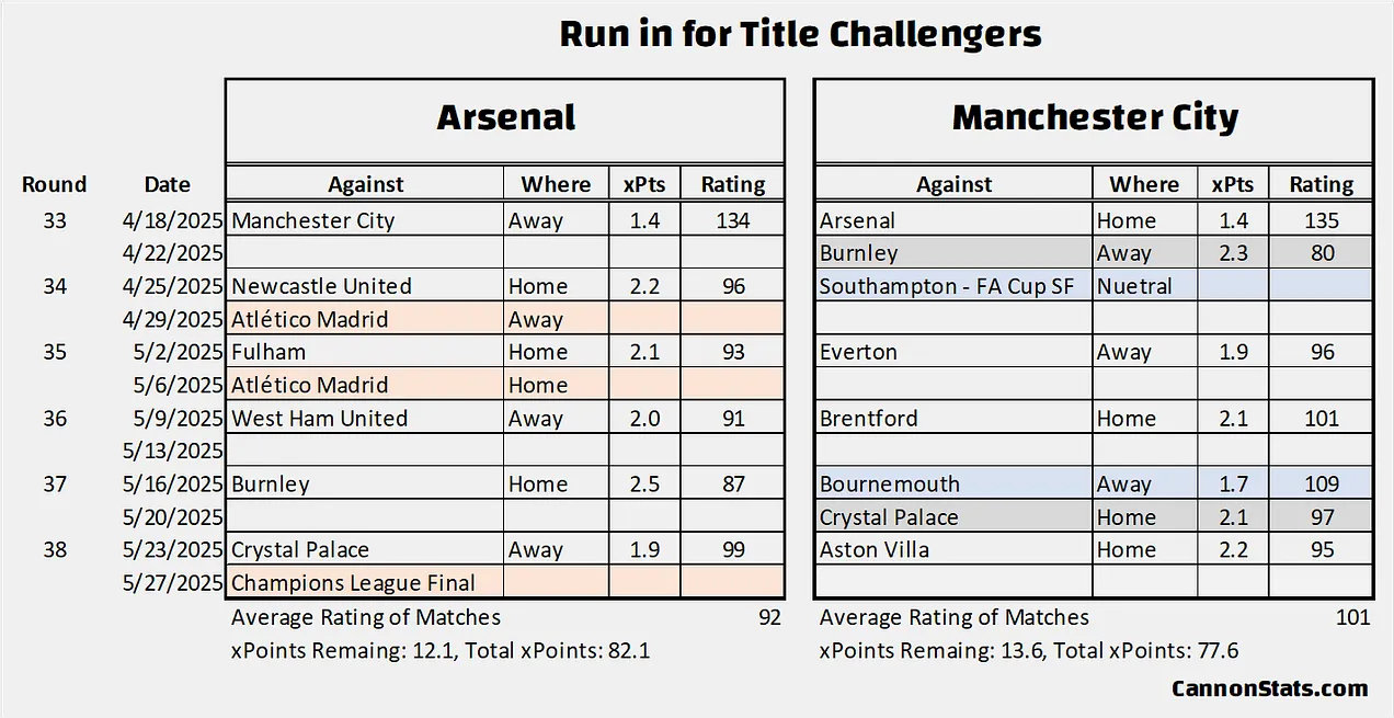 这背后的主要驱动因素是剩余赛程对阿森纳有利。