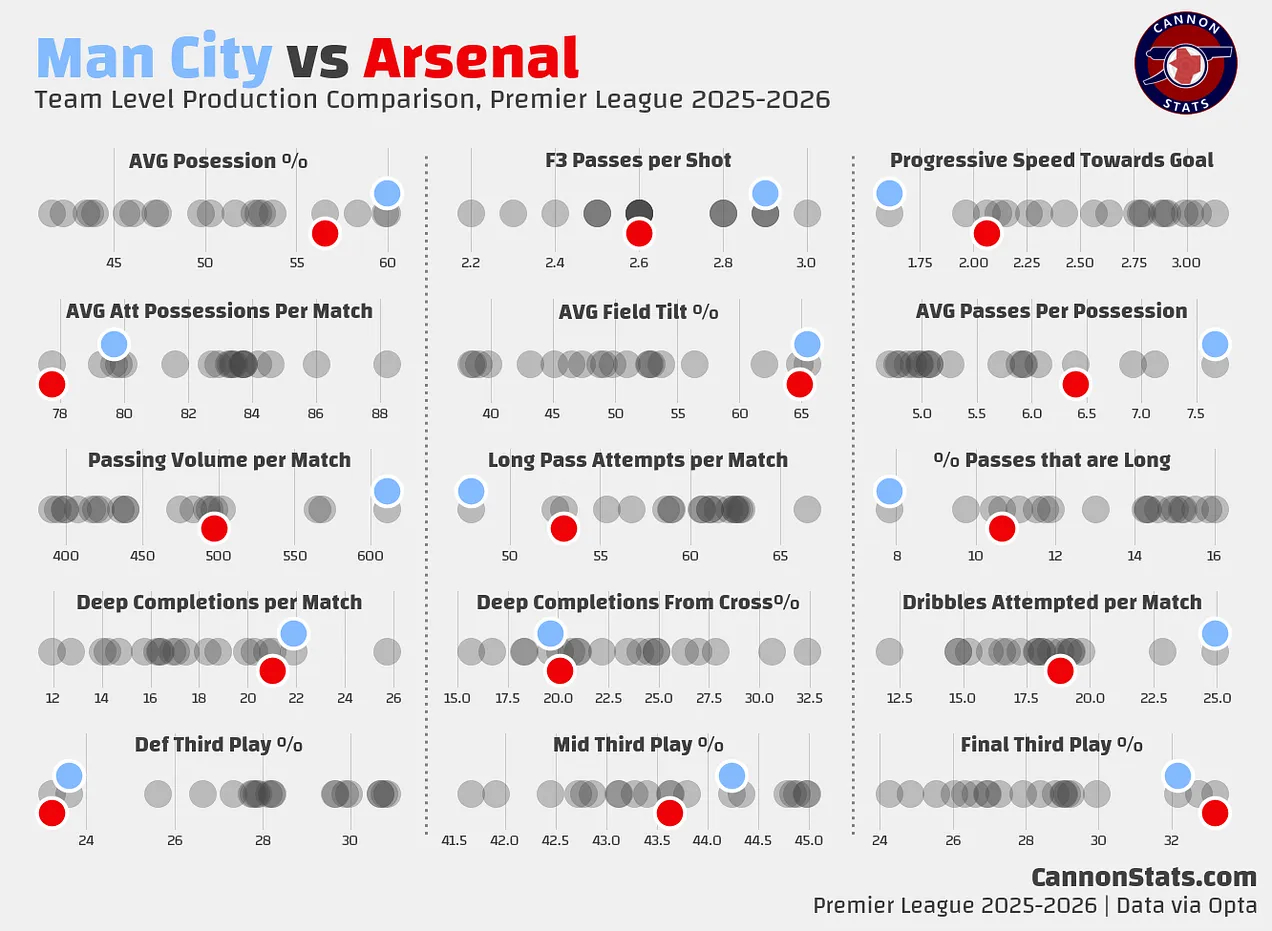 这些数据指标旨在衡量球队的"风格"或打法,并与英超其他球队比较。我们都对曼城足够熟悉,这里应该没什么意外的。他们与阿森纳风格相似,控球率高,打法有章法。考虑到比赛动机和背景,我预计周日的比赛将是曼城控制更多球权,而阿森纳寻求反击机会。