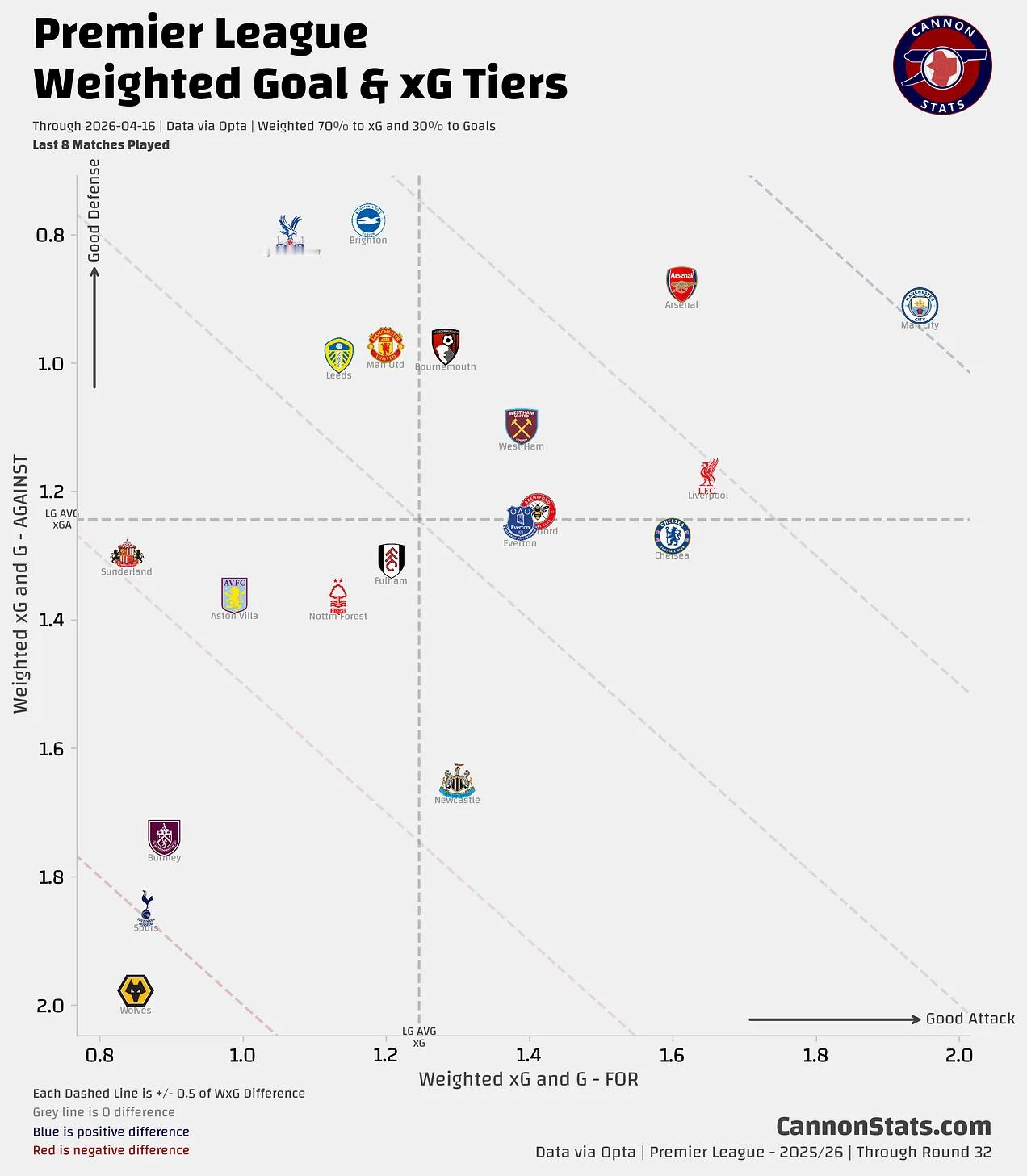 这取决于你选取的终点,情况可能看起来更好或更糟,但取最近八场比赛是近期状态和样本量之间的一个折中选择。这通常能平衡一些赛程难度、比赛局势和一般波动,足以捕捉我们想看的态势。