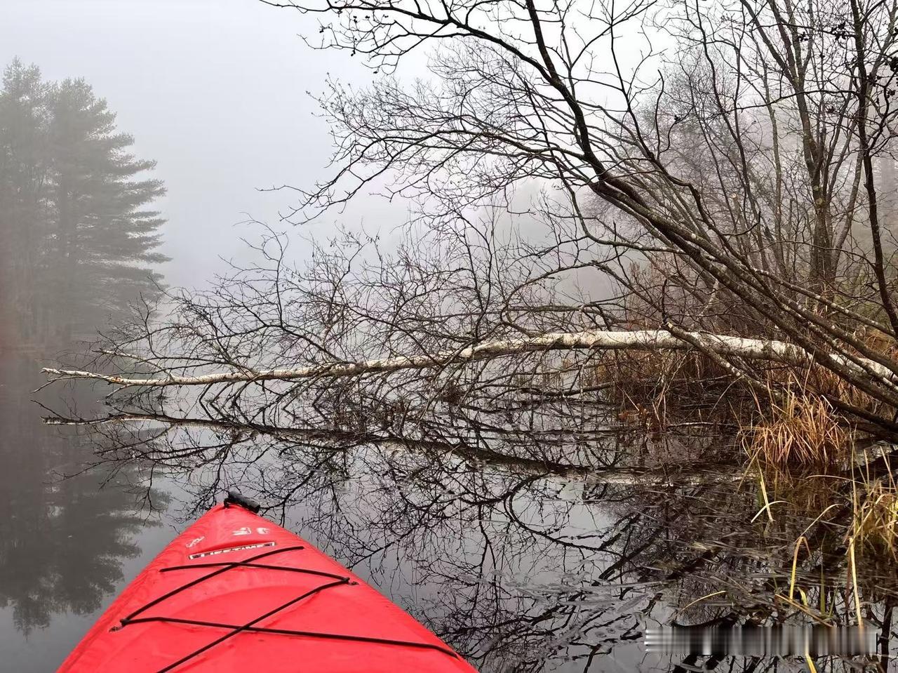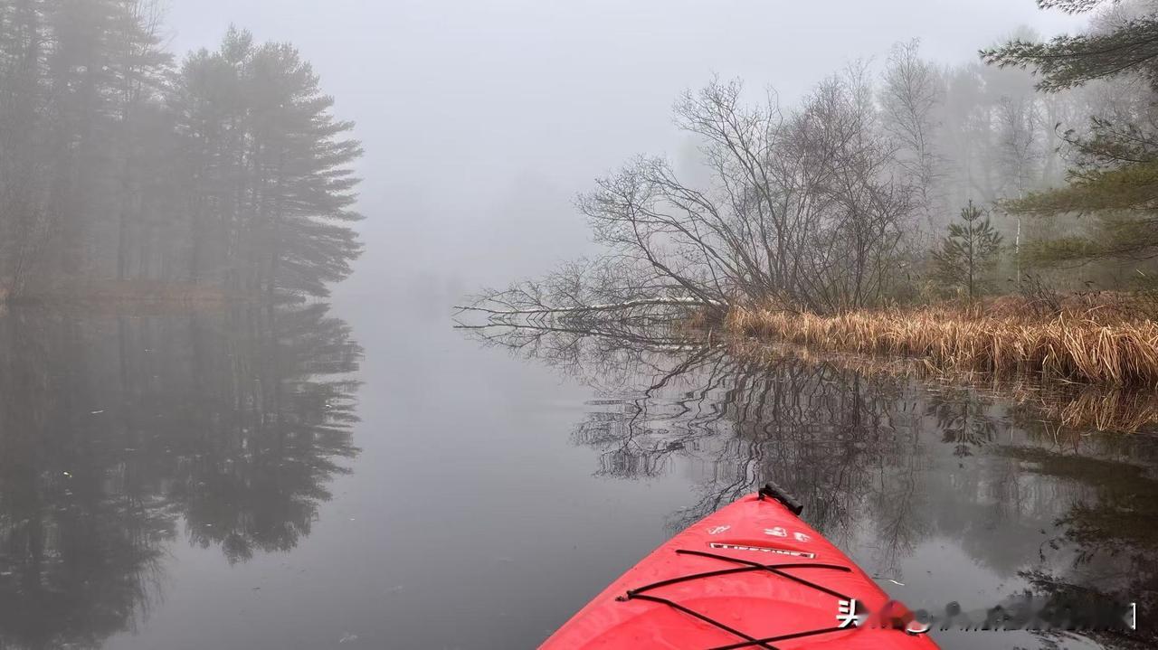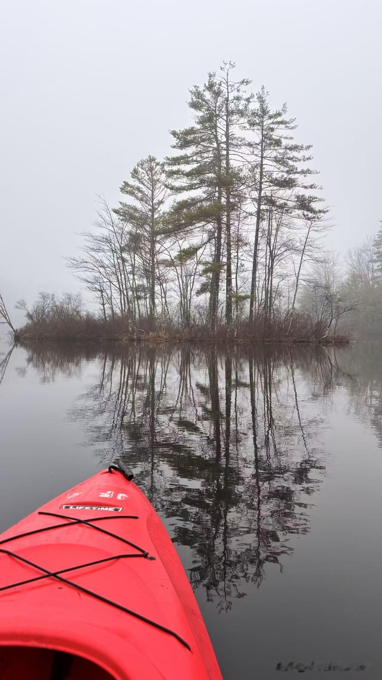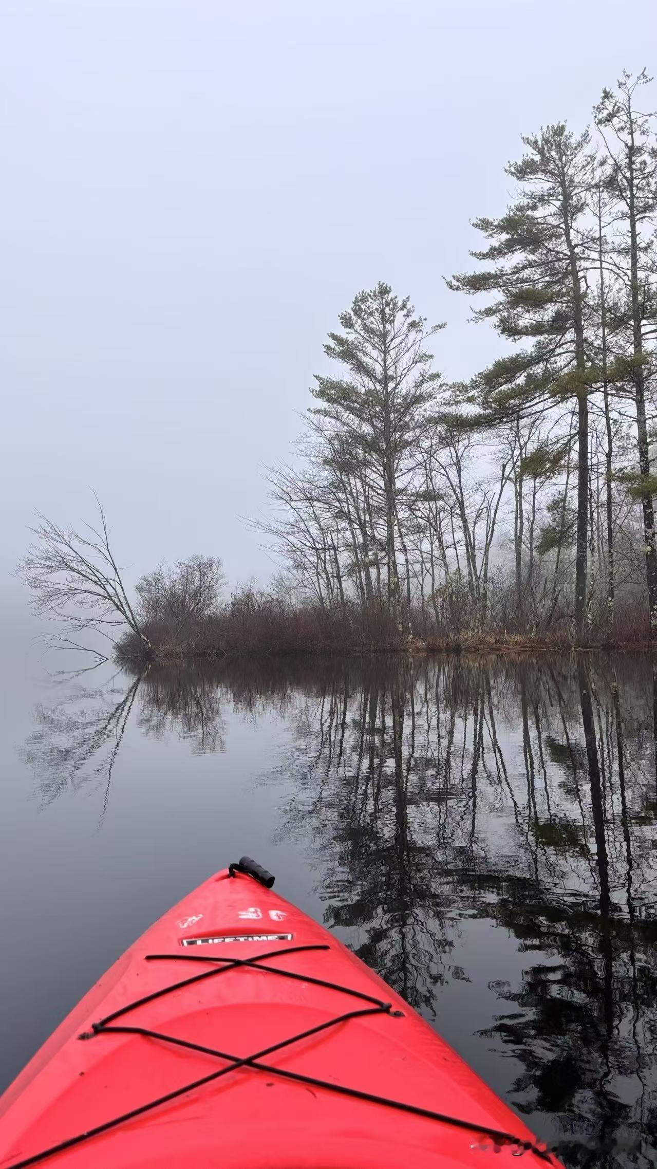 早晨,湖面雾气蒸腾,我架起自己的红色皮划艇,在湖面上享受难得一见的宁静时光。