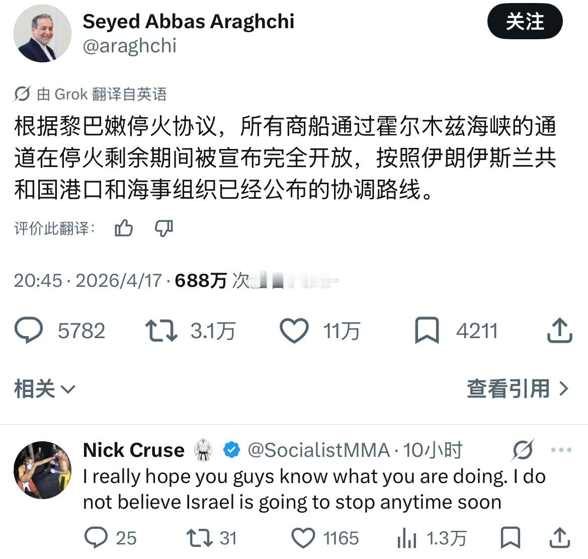 霍尔木兹海峡开放据法广:伊朗宣布在停战期间“全面”开放霍尔木兹海峡,稍早,以色列与黎巴嫩真主党民兵正式停战。伊朗外交部长Abbas Araghchi宣布:“鉴于黎巴嫩停火协议,目前宣布在停火剩余期间,霍尔木兹海峡对所有商业船只全面开放通行。所有船只需按照伊朗伊斯兰共和国港口与海事组织此前公布的协调航线通行。”