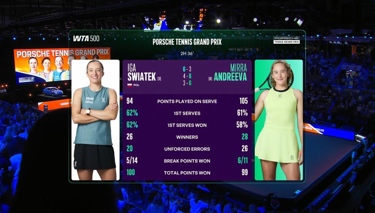 这是两人职业生涯第五次交手,安德列娃将自己与斯瓦泰克的交手战绩改写为3胜2负。
