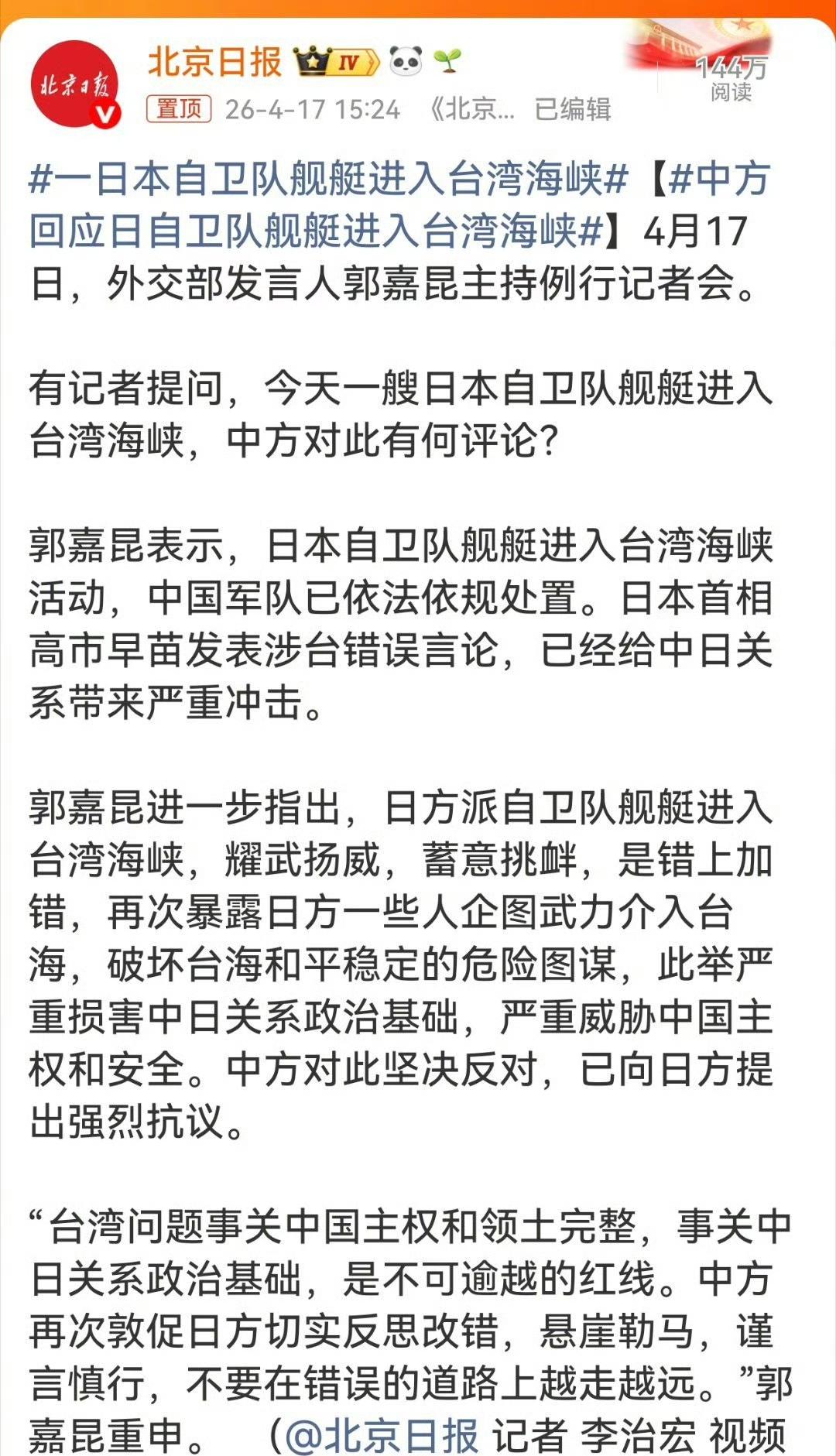 4月17日,在这个特殊的日子里,小日本的军舰过台湾海峡,这特么是故意上眼药。1895年的今天马关条约签署,小日本殖民统治了台湾50年。小日本专门挑今天过海峡,这挑衅的味道太浓了,这不能忍。