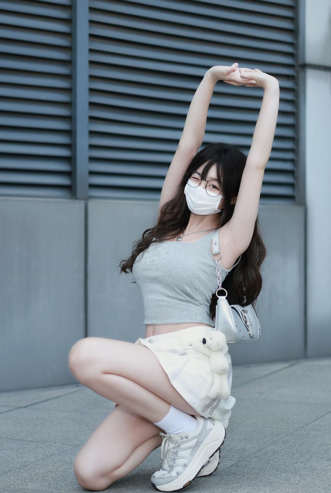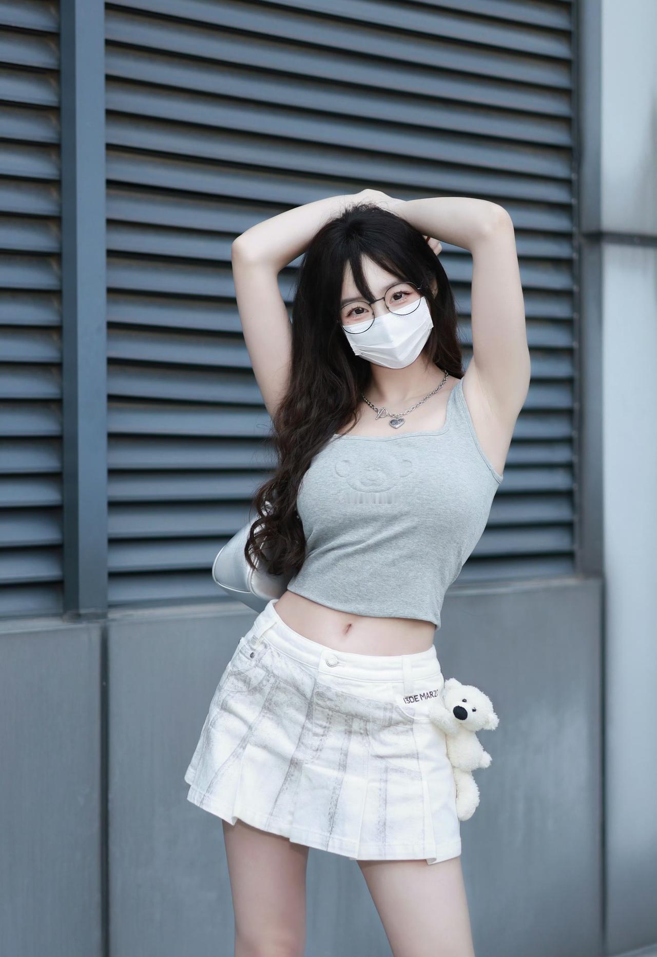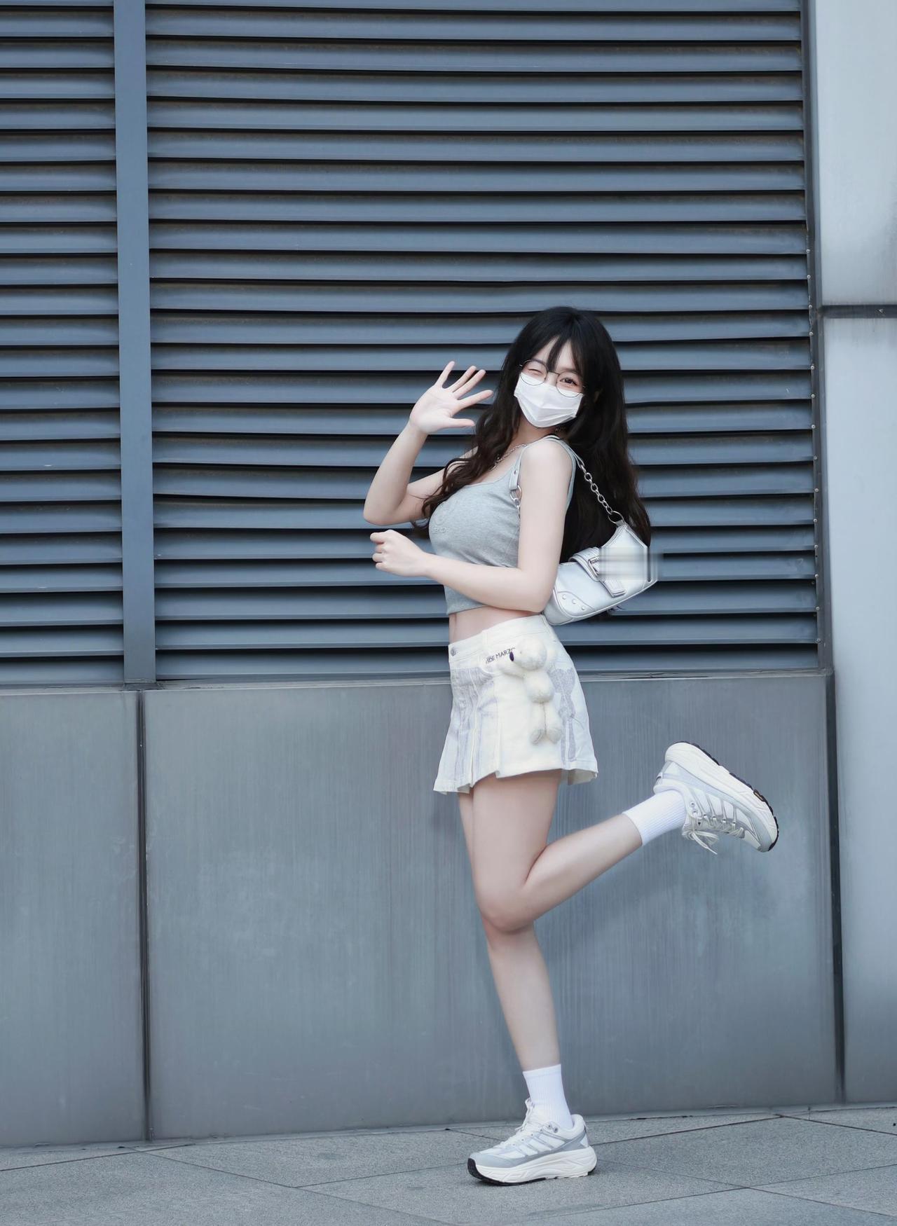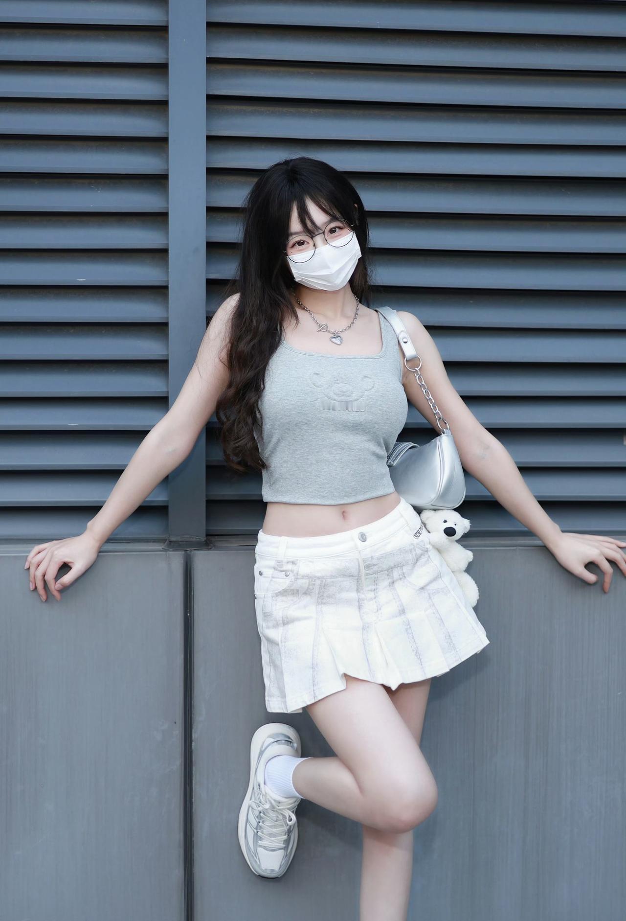 浅灰短款背心+白色百褶裙,搭配小熊挂饰和银色小挎包,甜美元素(百褶裙、毛绒装饰)混搭简约运动风,加上眼镜的点缀,是又嫩又飒的“校园甜妹”既视感~