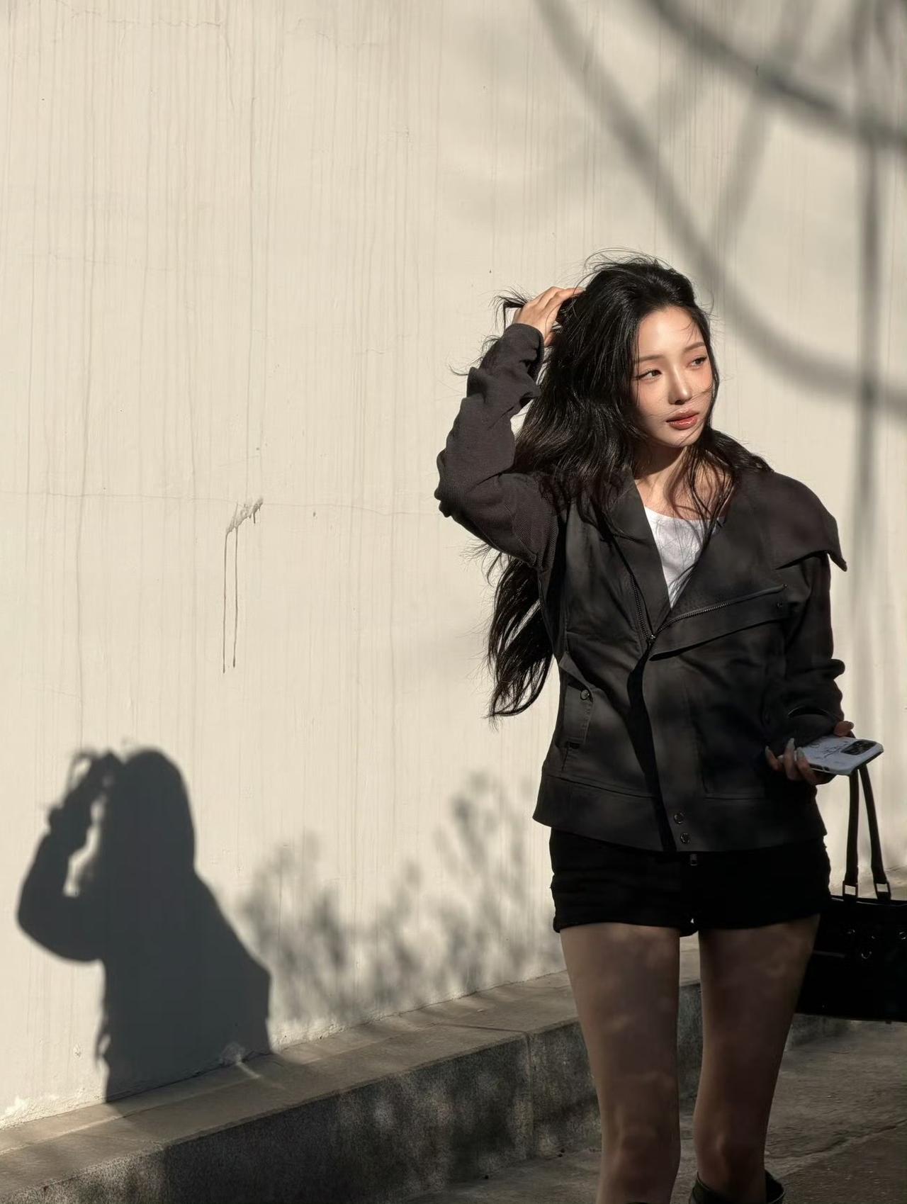 做旧黑夹克+短款内搭+短裤,搭配金属扣长靴和机车包,全黑look里藏着随性的酷感,短款露腰+长靴的组合还能优化比例,是“走路带风”的街头美人既视感~