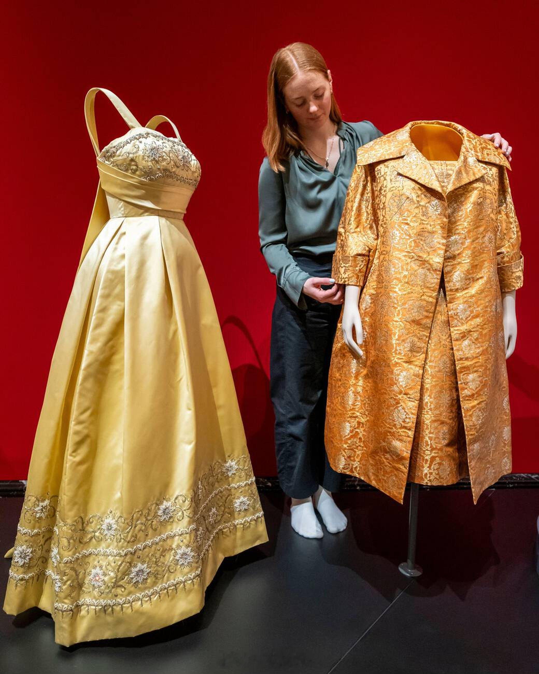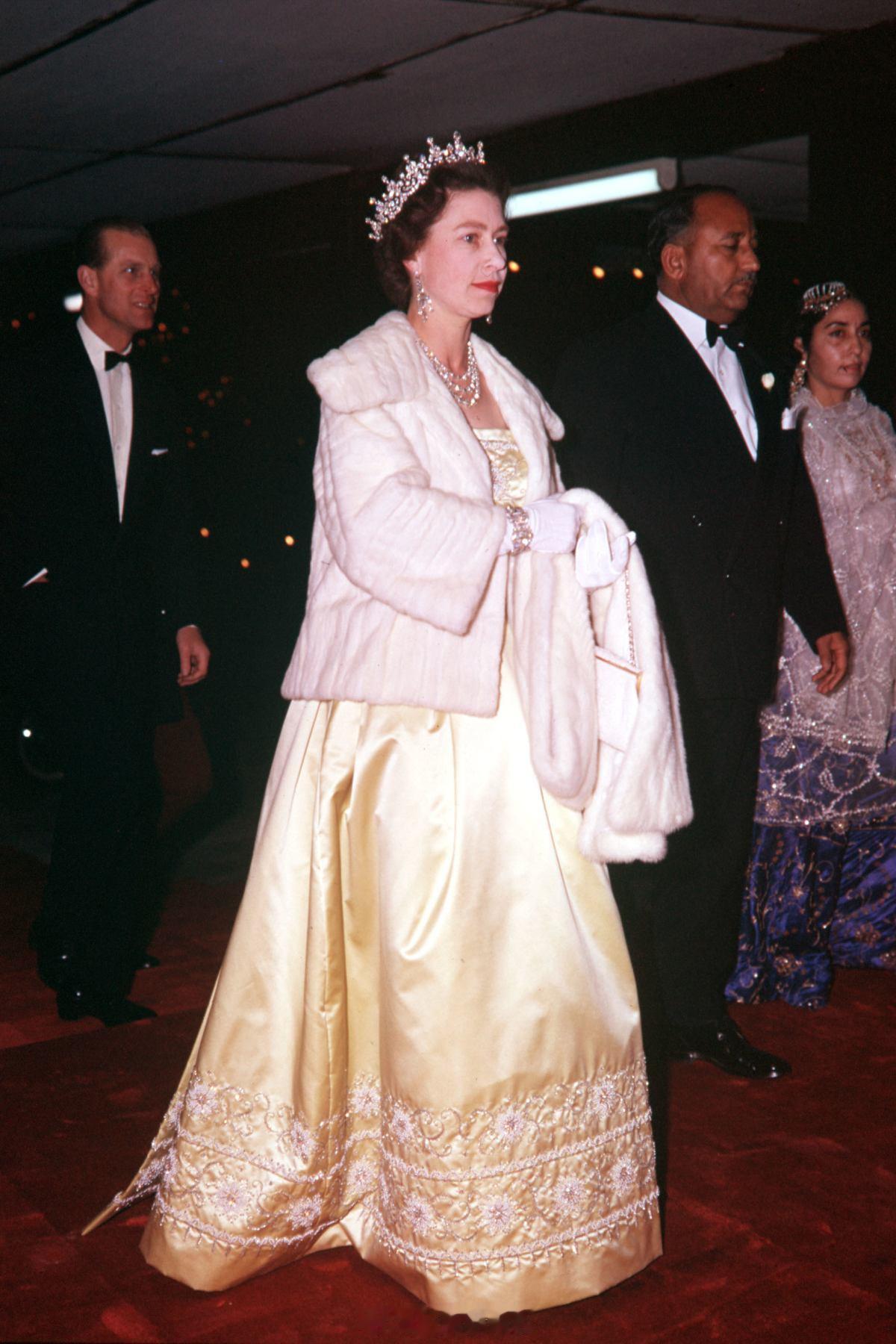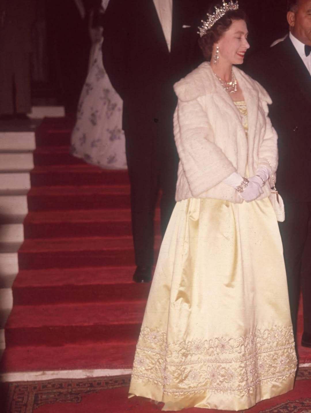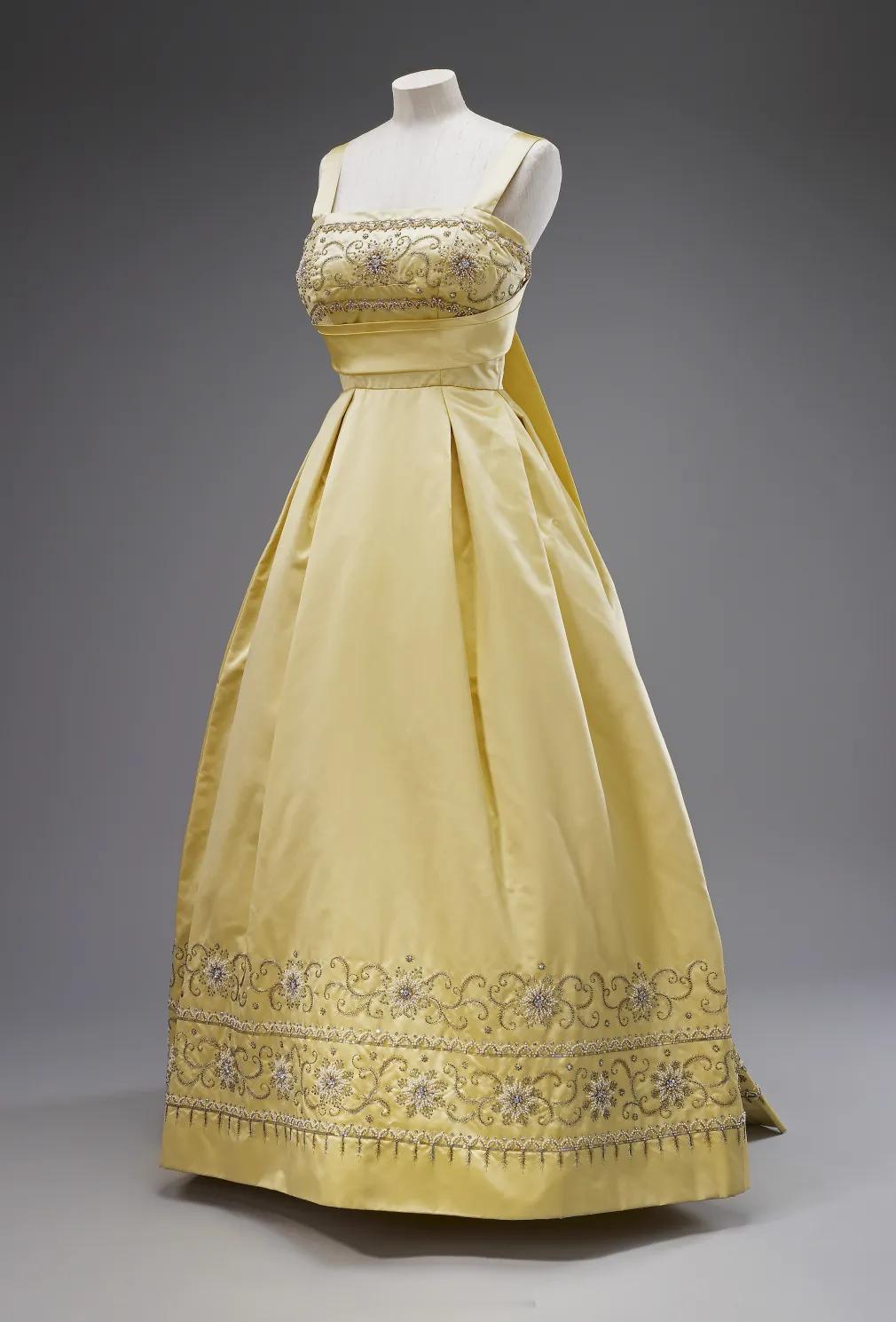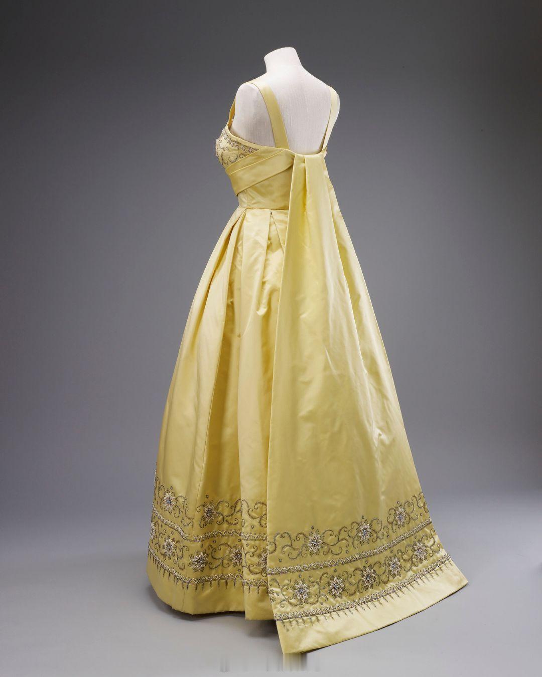 1961年2月10日,伊丽莎白二世女王在巴基斯坦拉合尔参加巴基斯坦总统Ayub Khan主持的晚宴🇵🇰她那时候穿的是服装设计师Hardy Amies设计的鹅黄色吊带缎面晚礼服,目前陈列在白金汉宫国王画廊👗
