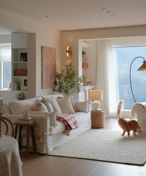 全屋颜色要有主次,墙面、地面、窗帘这些大面积色块选同色系,沙发、挂画、抱枕这些点缀色可以跳一点,但全屋颜色别超过3种。网友@小太阳说:“我家定了奶油白+原木色,怎么搭都不出错。”