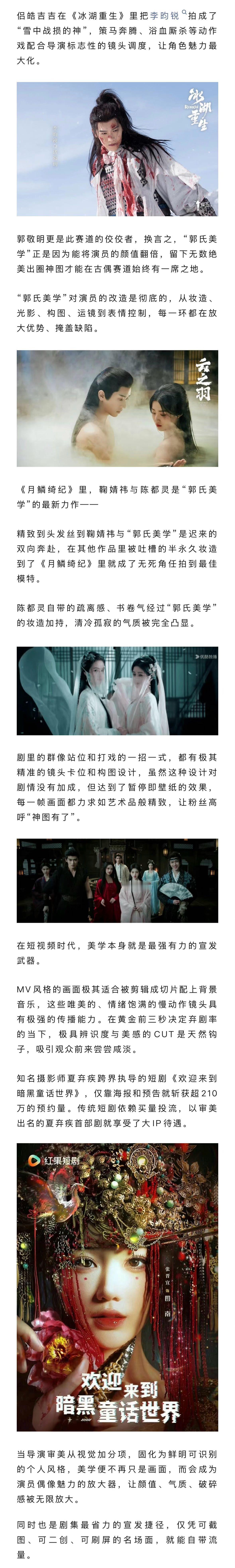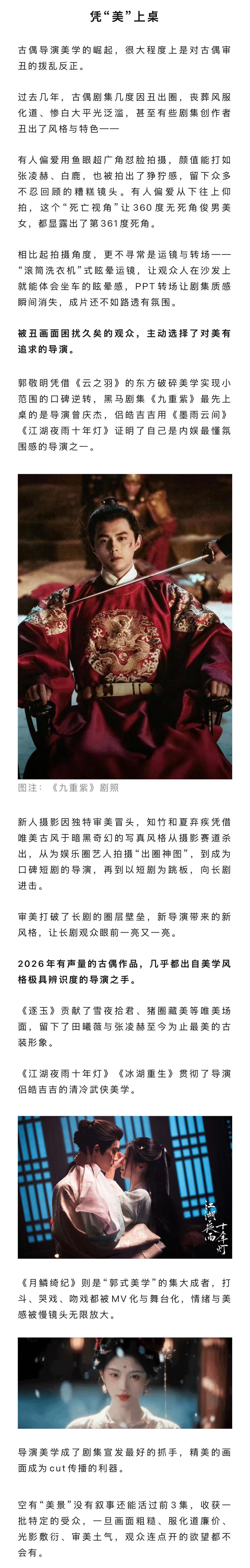 古偶导演凭审美上桌之后呢导演美学是古偶加成还是枷锁古偶导演美学的崛起,本质是观众对长期 “审丑” 的反叛,曾庆杰的光影构图、侣皓吉吉的清冷氛围感、郭敬明的精致 MV 风帮助他们确立了导演美学IP;摄影师跨界执导、短剧导演进击长剧,更是打破圈层壁垒,让古偶视觉质感全面升级。但美学不该是独立的展示,更应服务于人物与剧情。